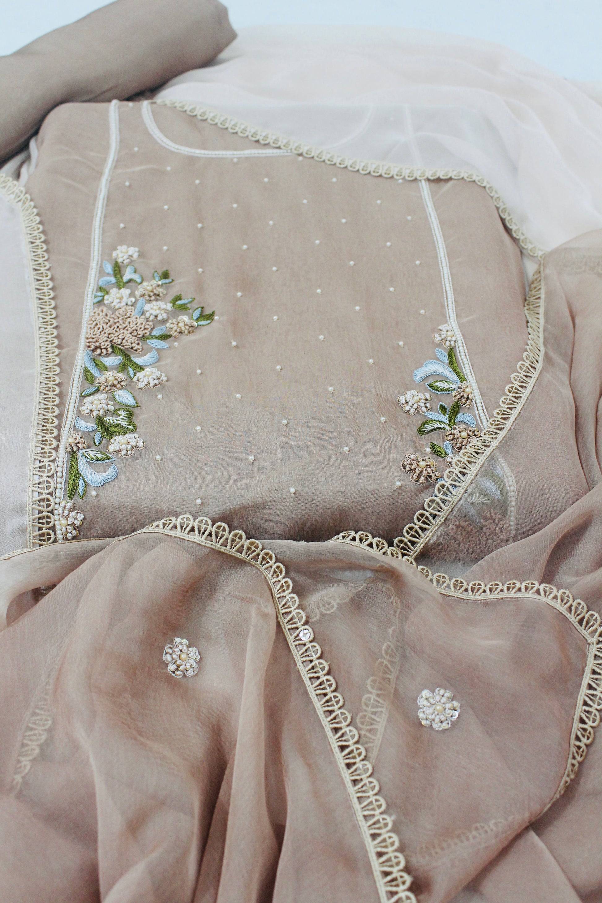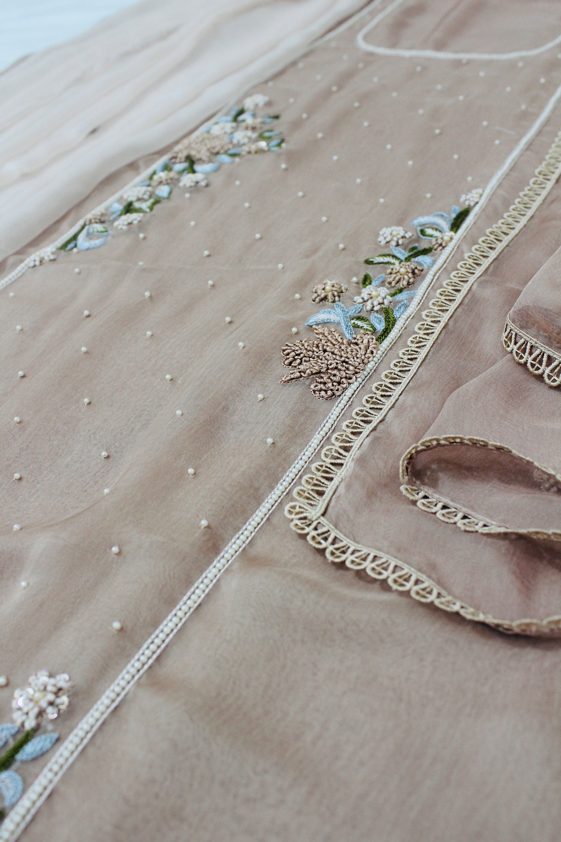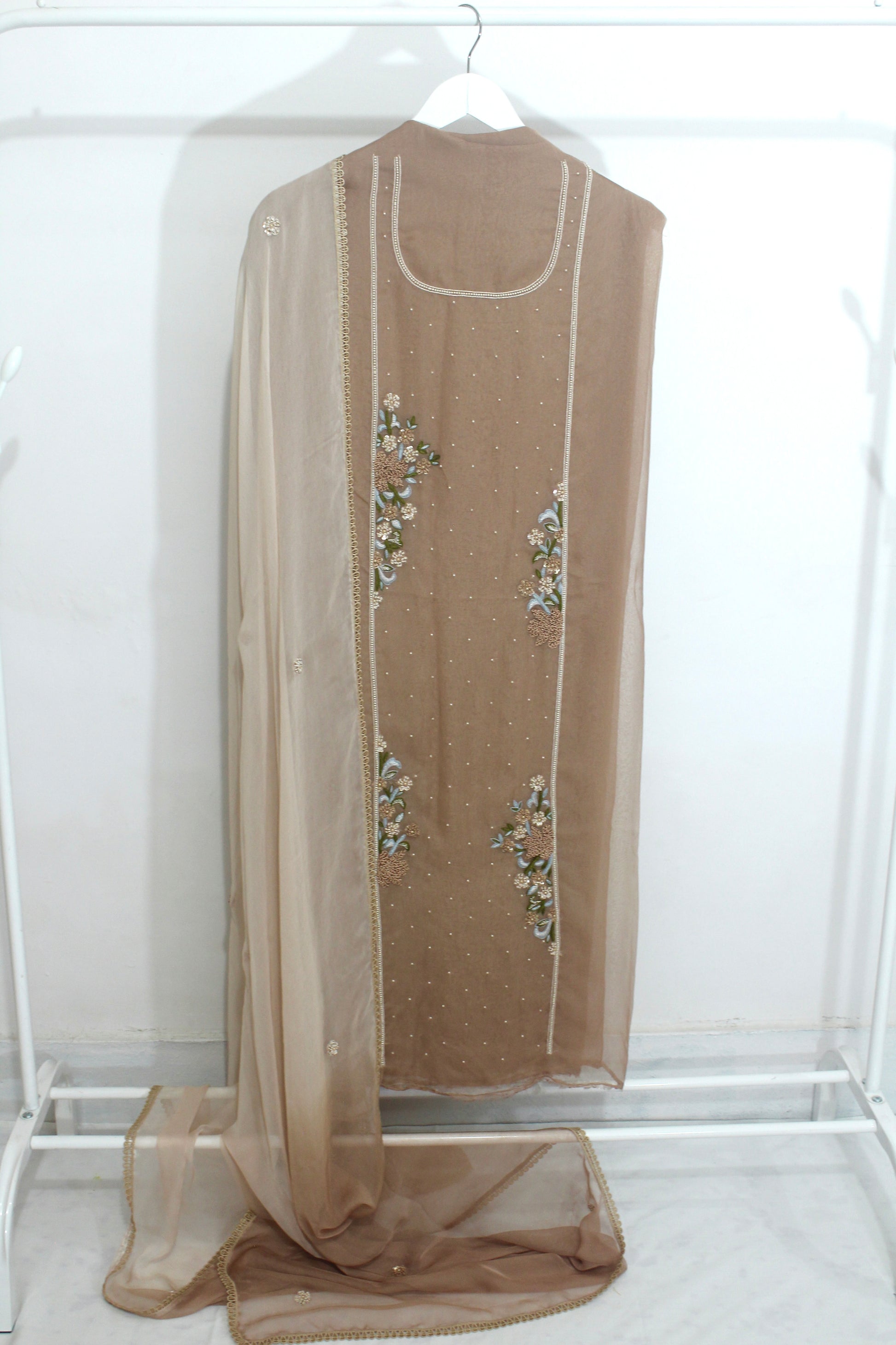 The neckline and side panels of the kurta are further enhanced with delicate moti handwork, lending a refined finish. The accompanying dupatta complements the main garment with its gradient effect, transitioning from a lighter beige to a deeper brown, and features matching lace trim along its edges.