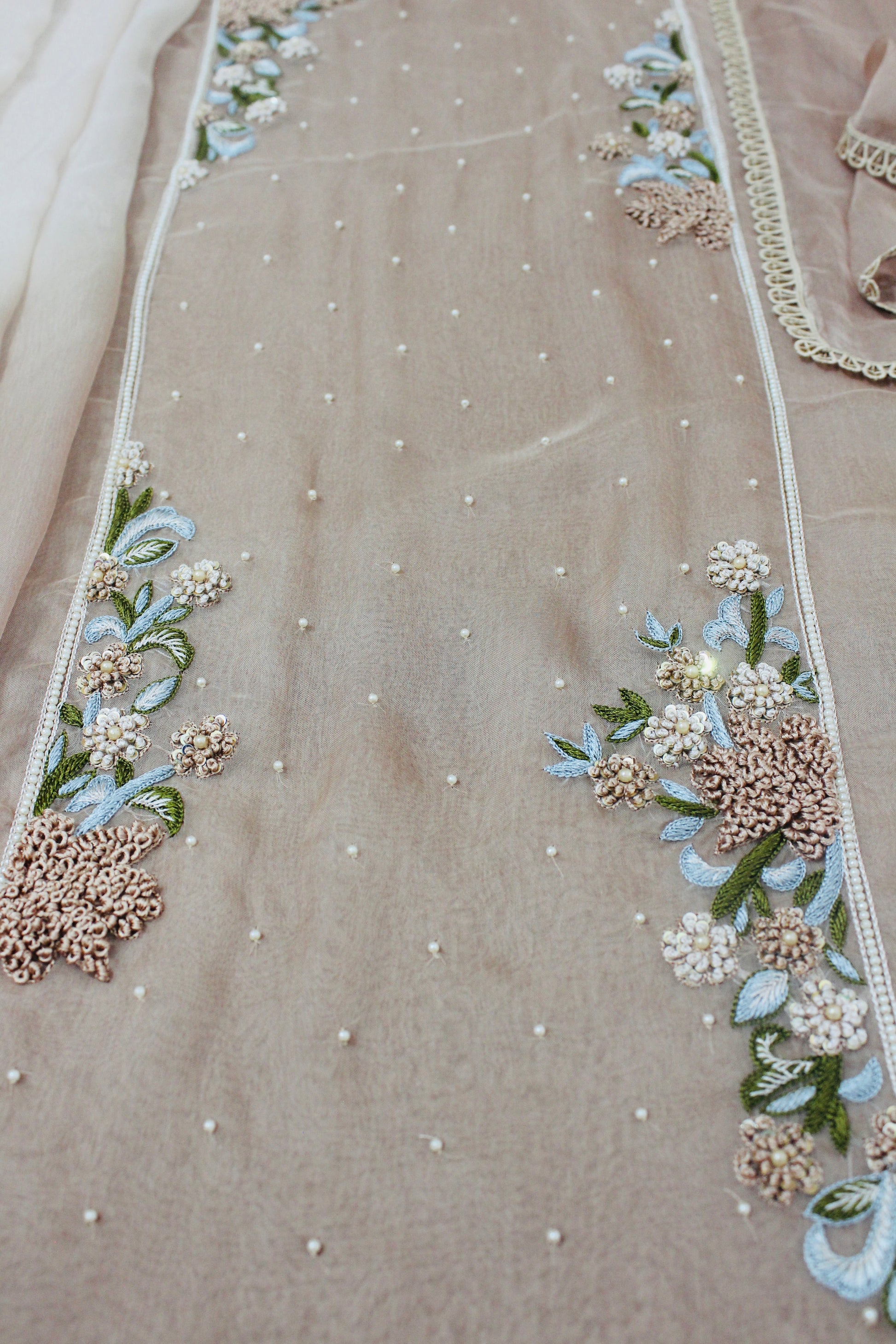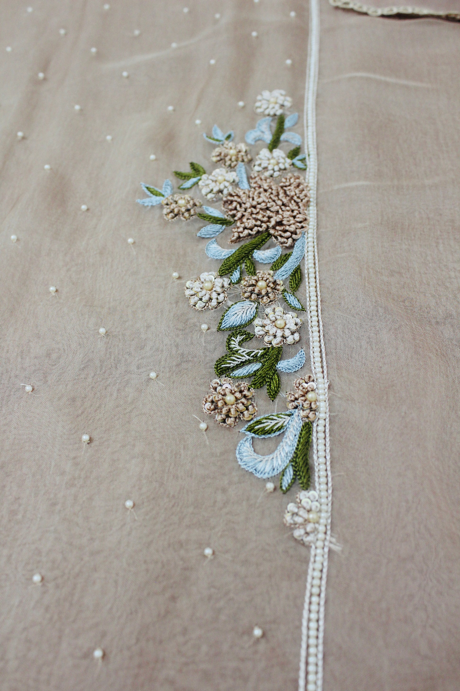 The kurta (top) is beautifully adorned with intricate resham and moti work, showcasing clusters of delicate blossoms and leaves in serene shades of light blue, soft green, and cream/off-white. This hand-stitched detailing is strategically placed, with prominent floral motifs gracing the shoulders/upper chest area and extending down the sides of the garment, creating a flattering silhouette. Tiny scattered pearl or bead embellishments add subtle sparkle throughout the kurta.