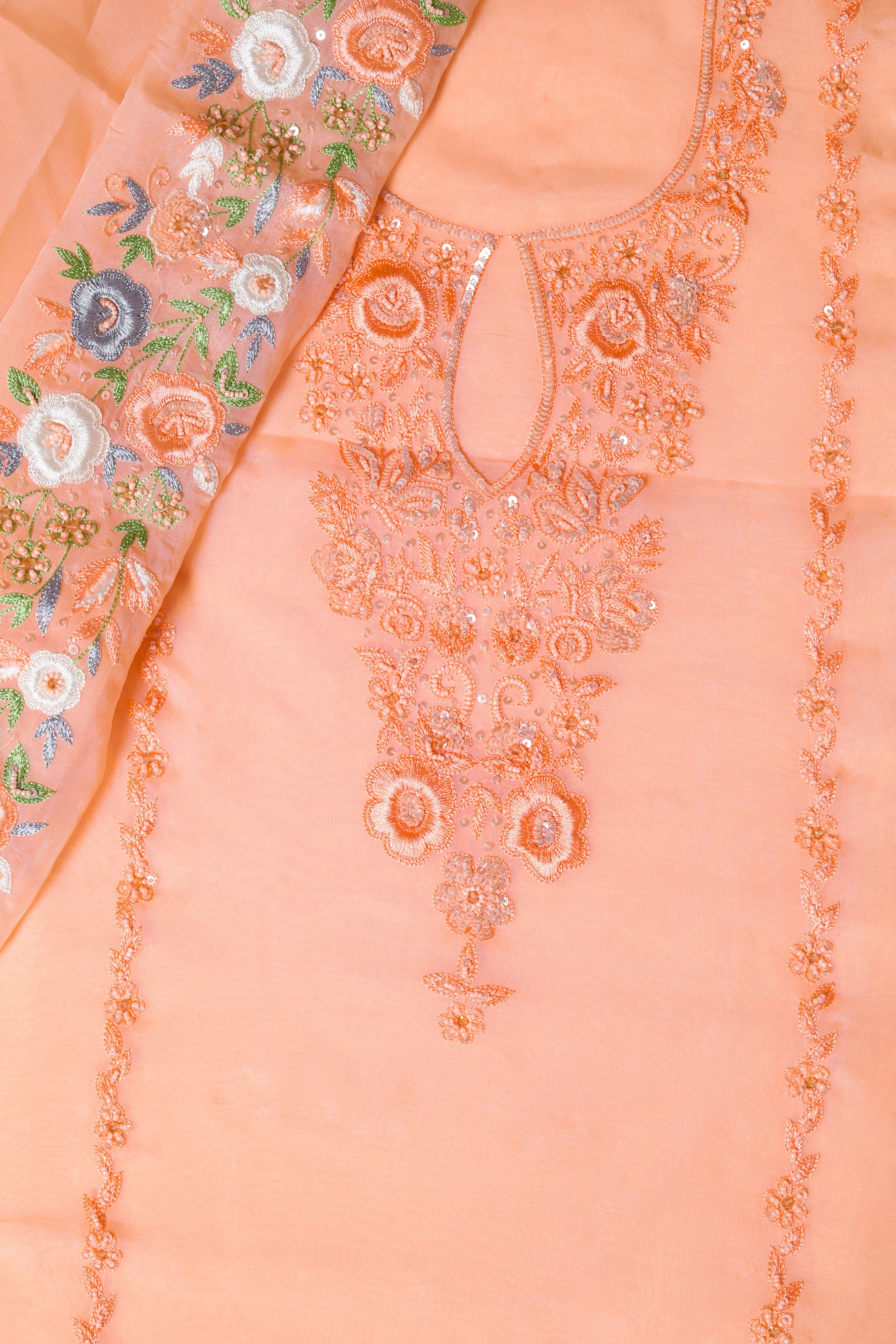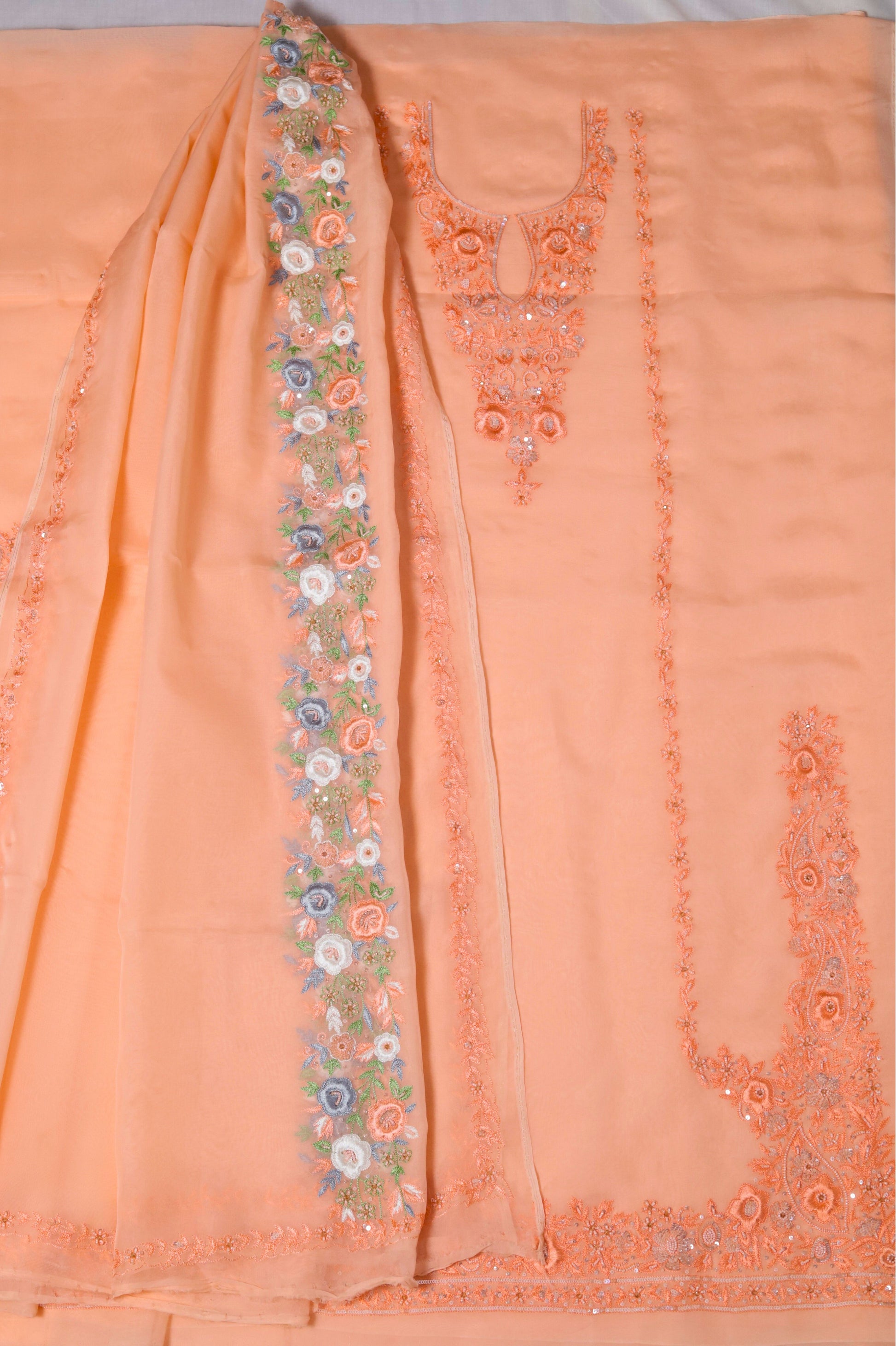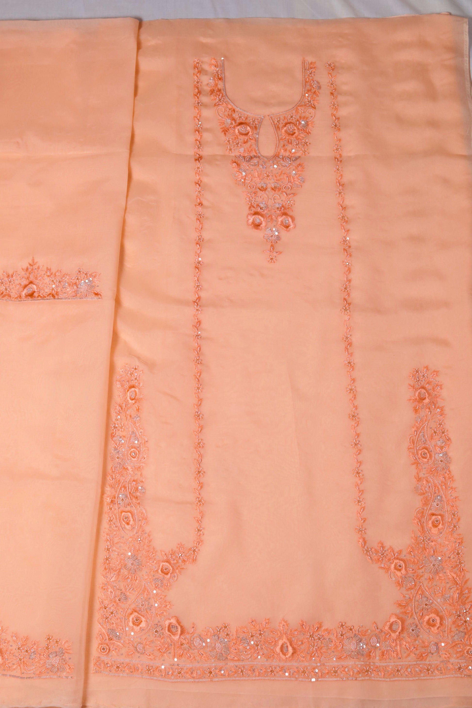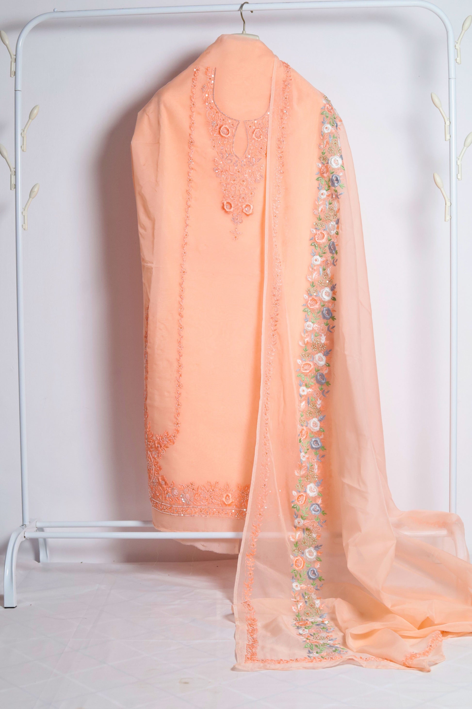 Indulge in the luxurious elegance of this suit. This peach-coloured masterpiece, with resham aari work, exudes sophistication and exclusivity. With its delicate design, this dress is a work of art that will elevate any occasion. Embrace the beauty and grace of the Azalea suit