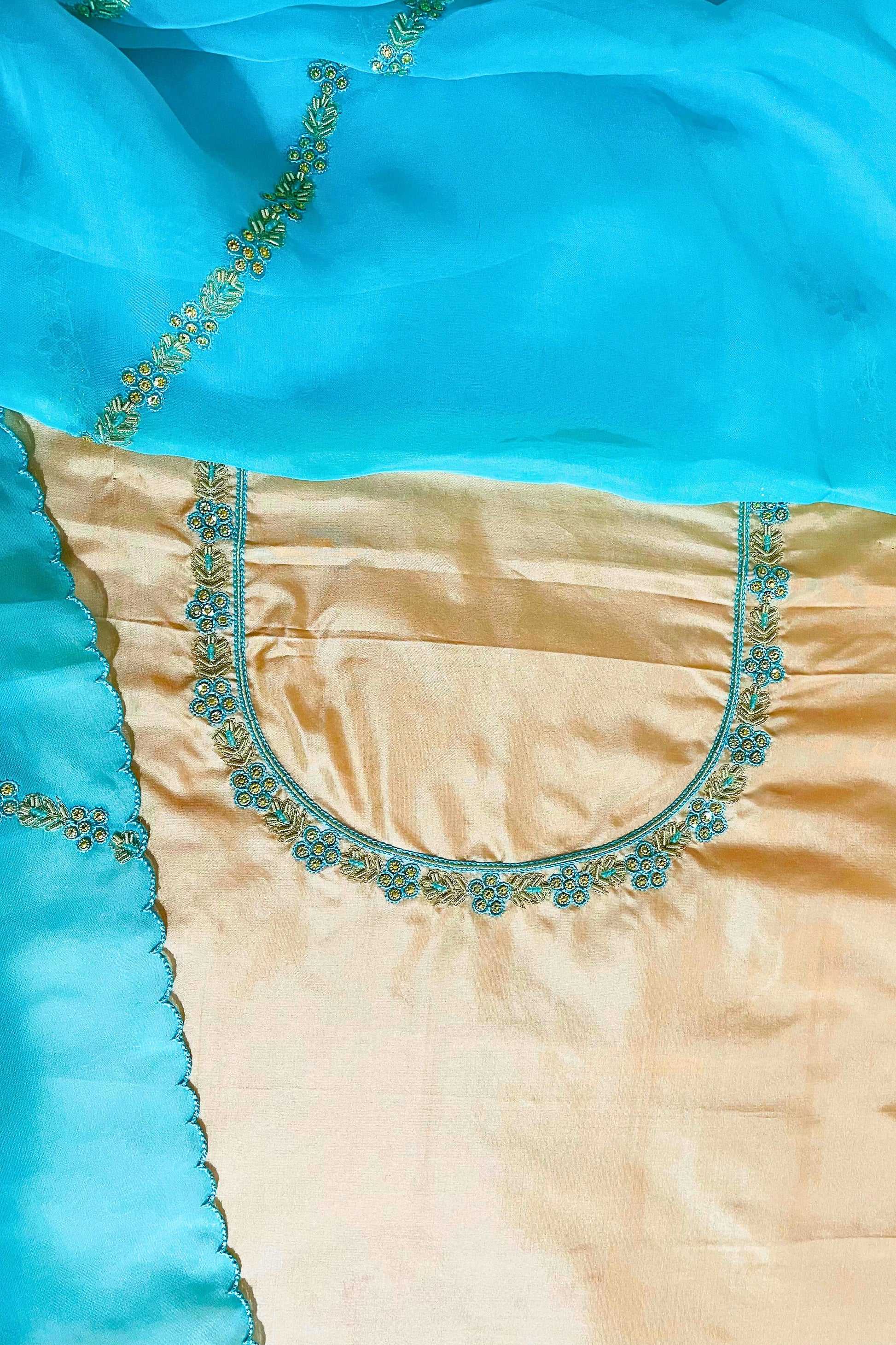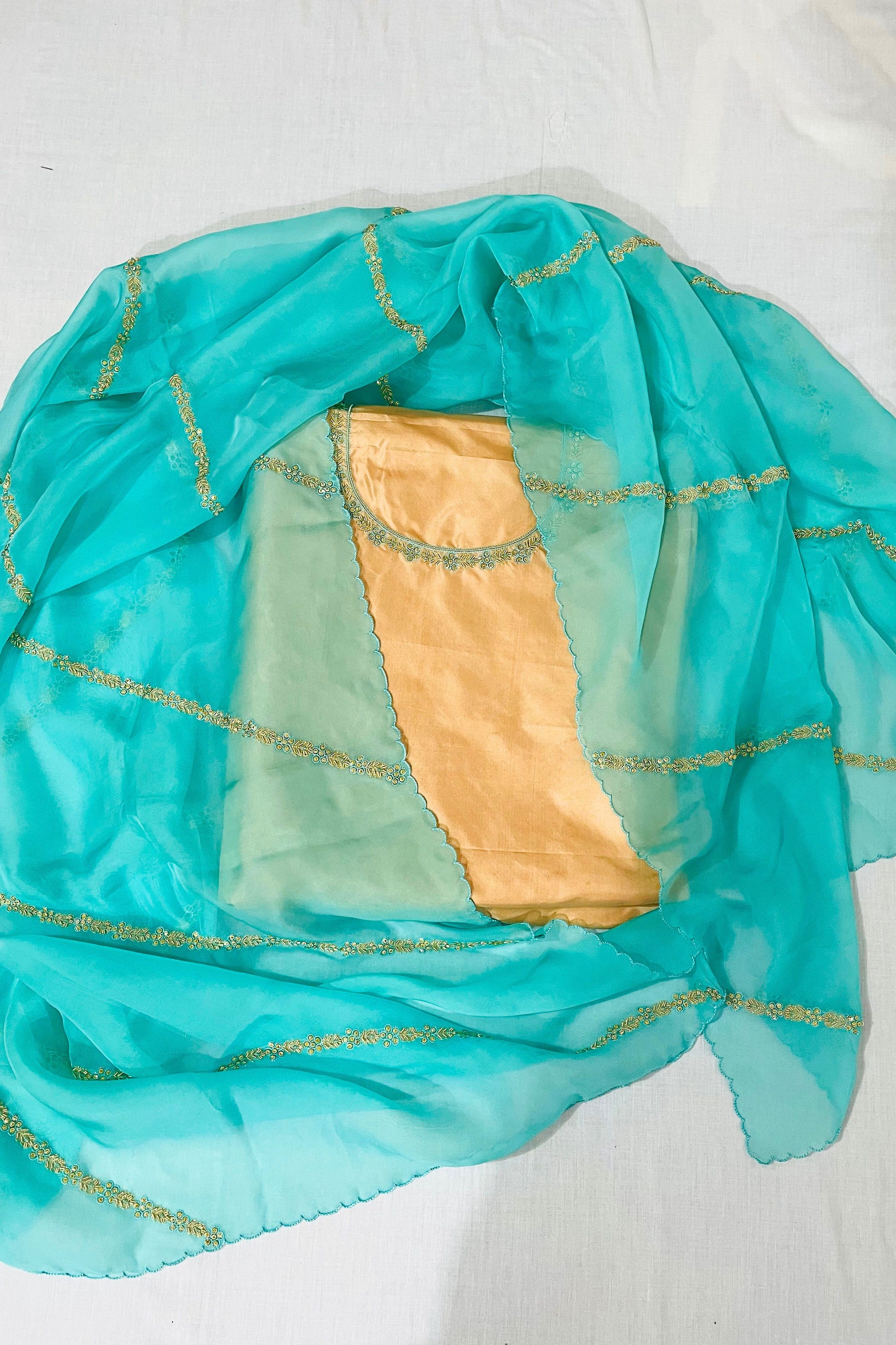 Step into the spotlight with our exquisite golden suit adorned with sea green dupatta, a stunning blend of opulence and grace. This enchanting ensemble features a luxurious golden silk fabric that drapes elegantly, creating a regal silhouette. The sea green dupatta adds a touch of freshness and sophistication, reminiscent of ocean hues. The delicate detailing enhances the overall allure and makes it perfect for special occasions and formal events.