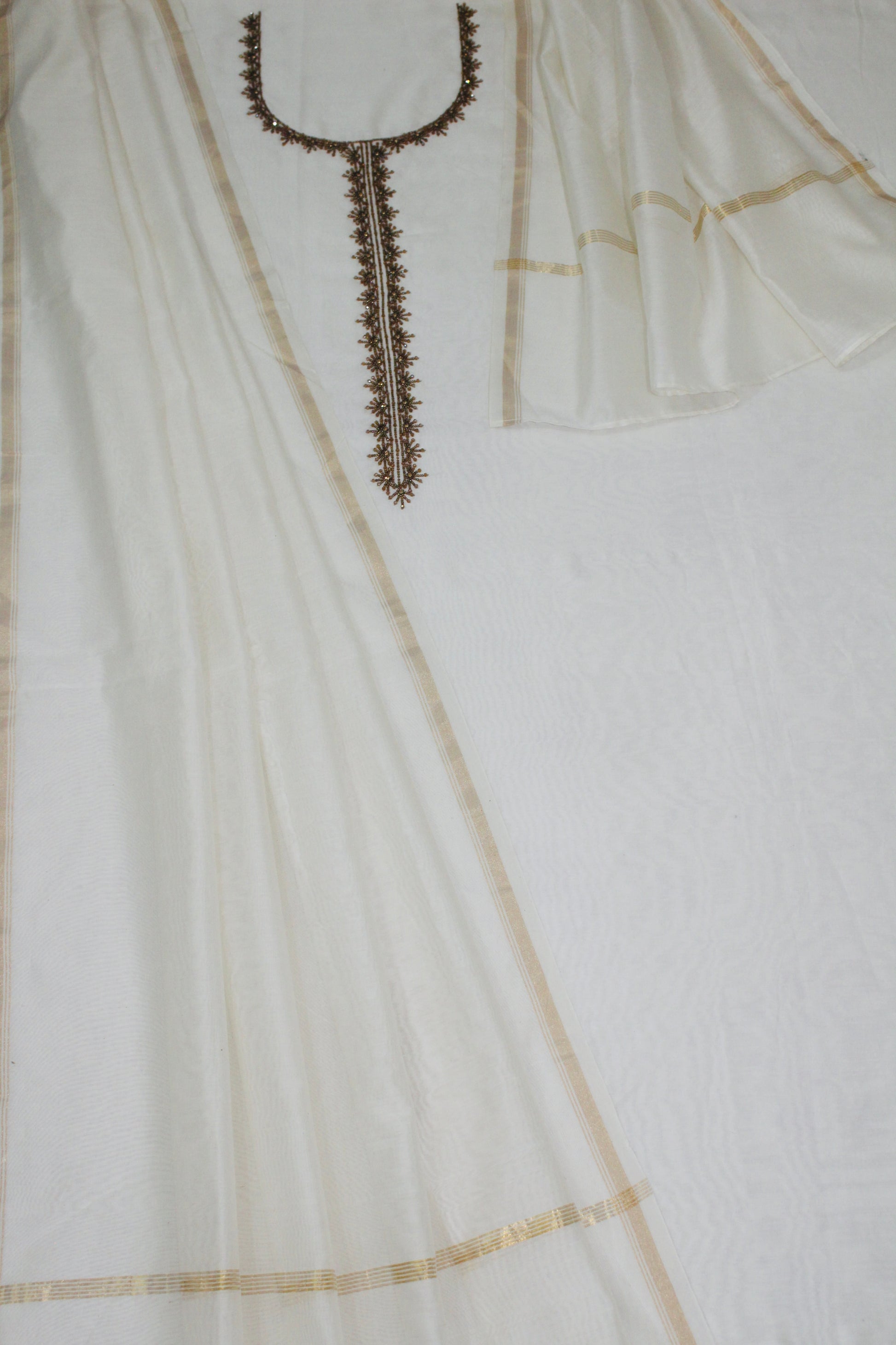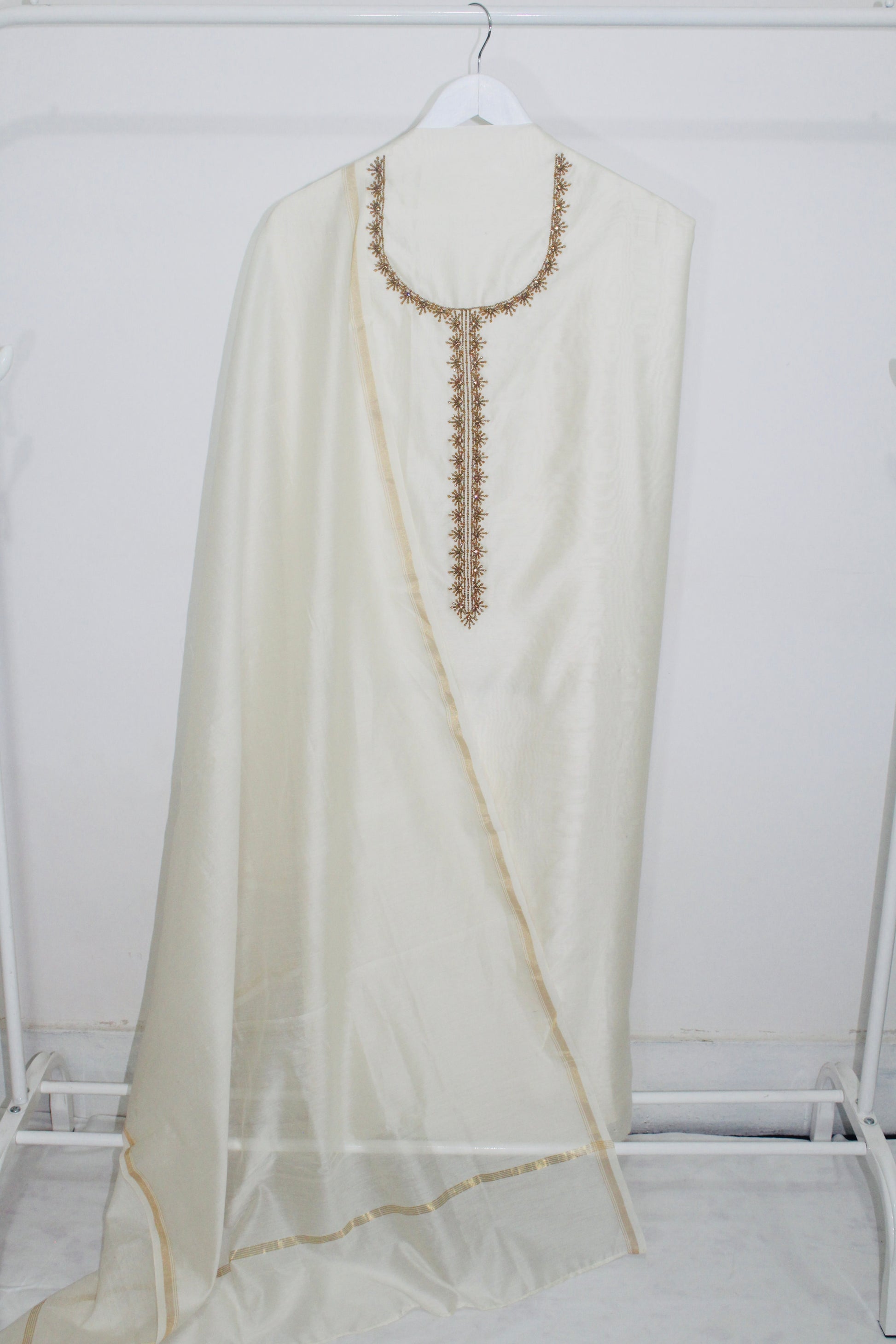 The set includes a matching dupatta, also in off white, with subtle border detailing that complements the main outfit. This versatile ensemble is perfect for a variety of occasions, from formal gatherings and festive celebrations to elegant evening events. Its classic color and refined detailing make it a wardrobe staple for those who appreciate understated luxury and traditional craftsmanship.