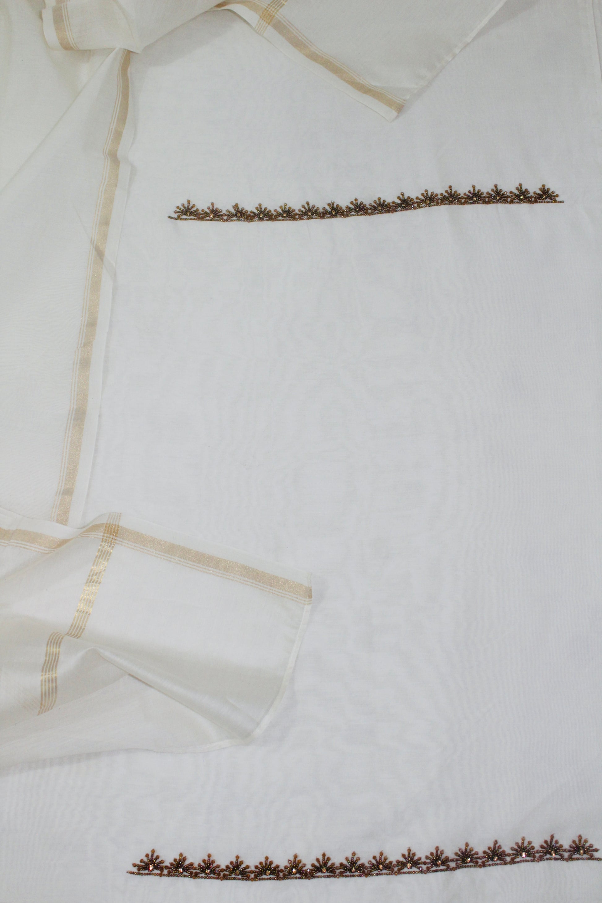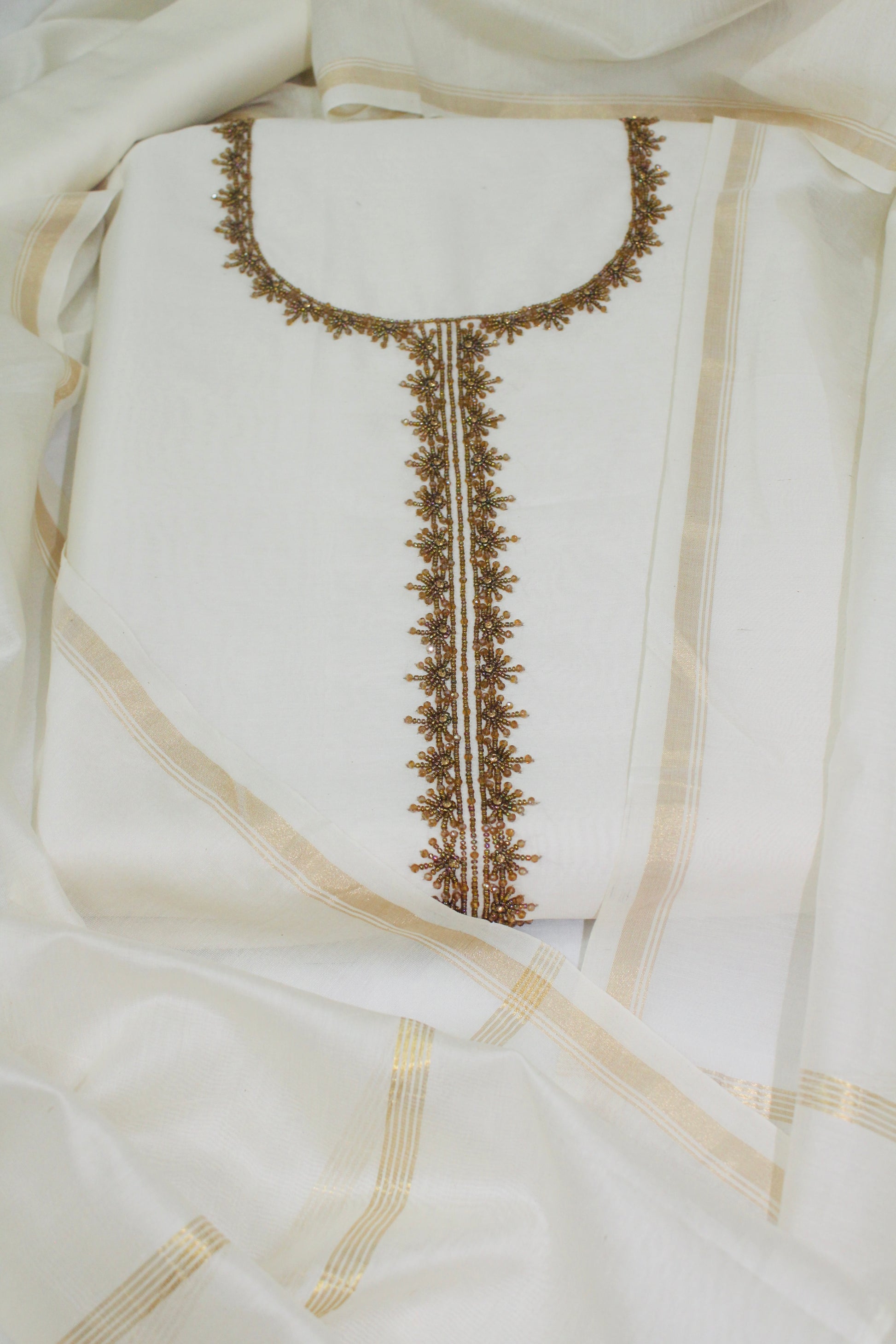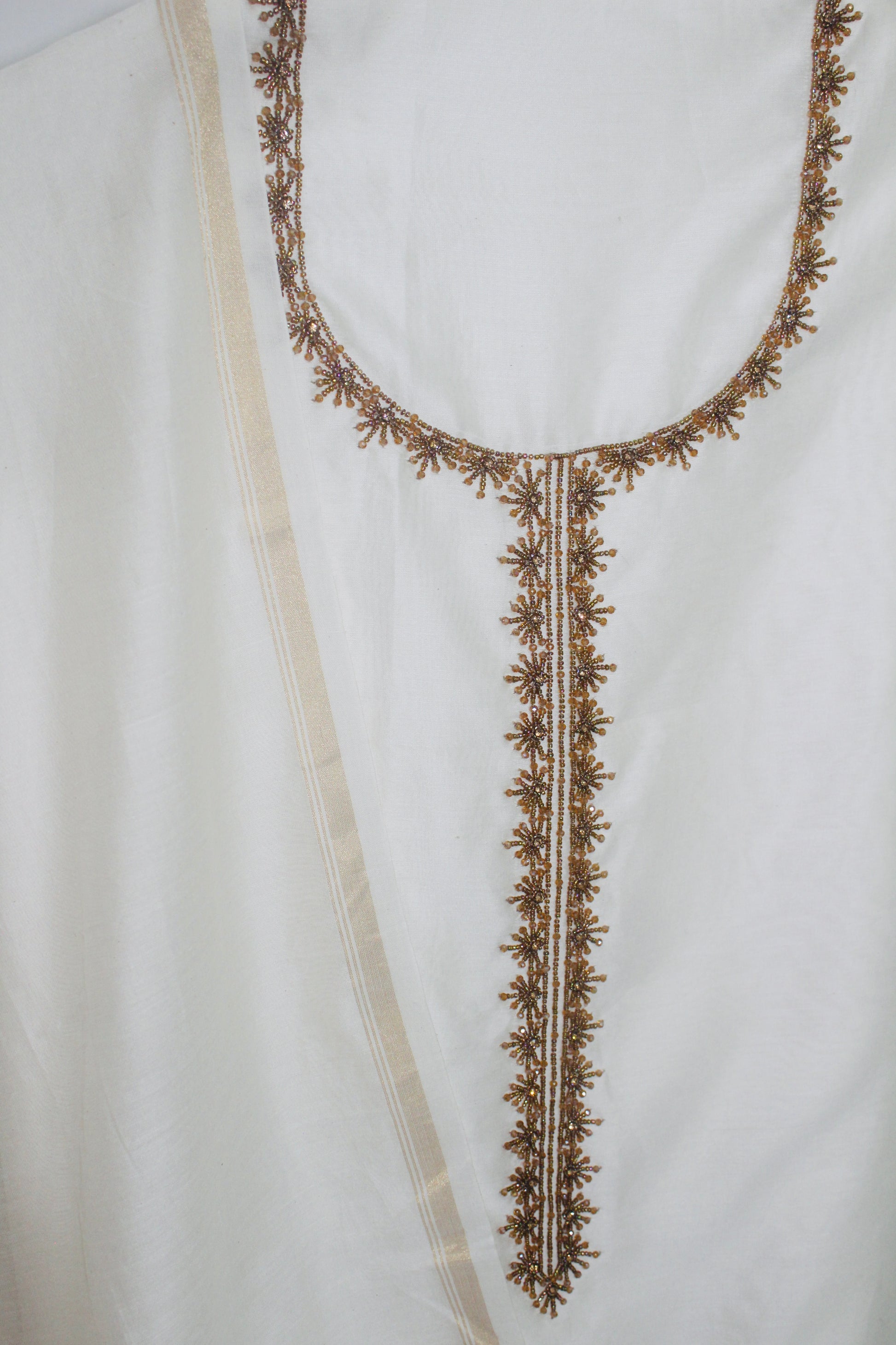 The highlight of this piece is the stunningly intricate cut daana work adorning the neckline. Delicately hand-embroidered with cut daana, the embellishment forms a graceful U-neck design that extends down the front in a continuous, embellished placket. The beadwork features a repeating pattern of star-like motifs or small floral clusters, adding a touch of traditional charm and shimmer.