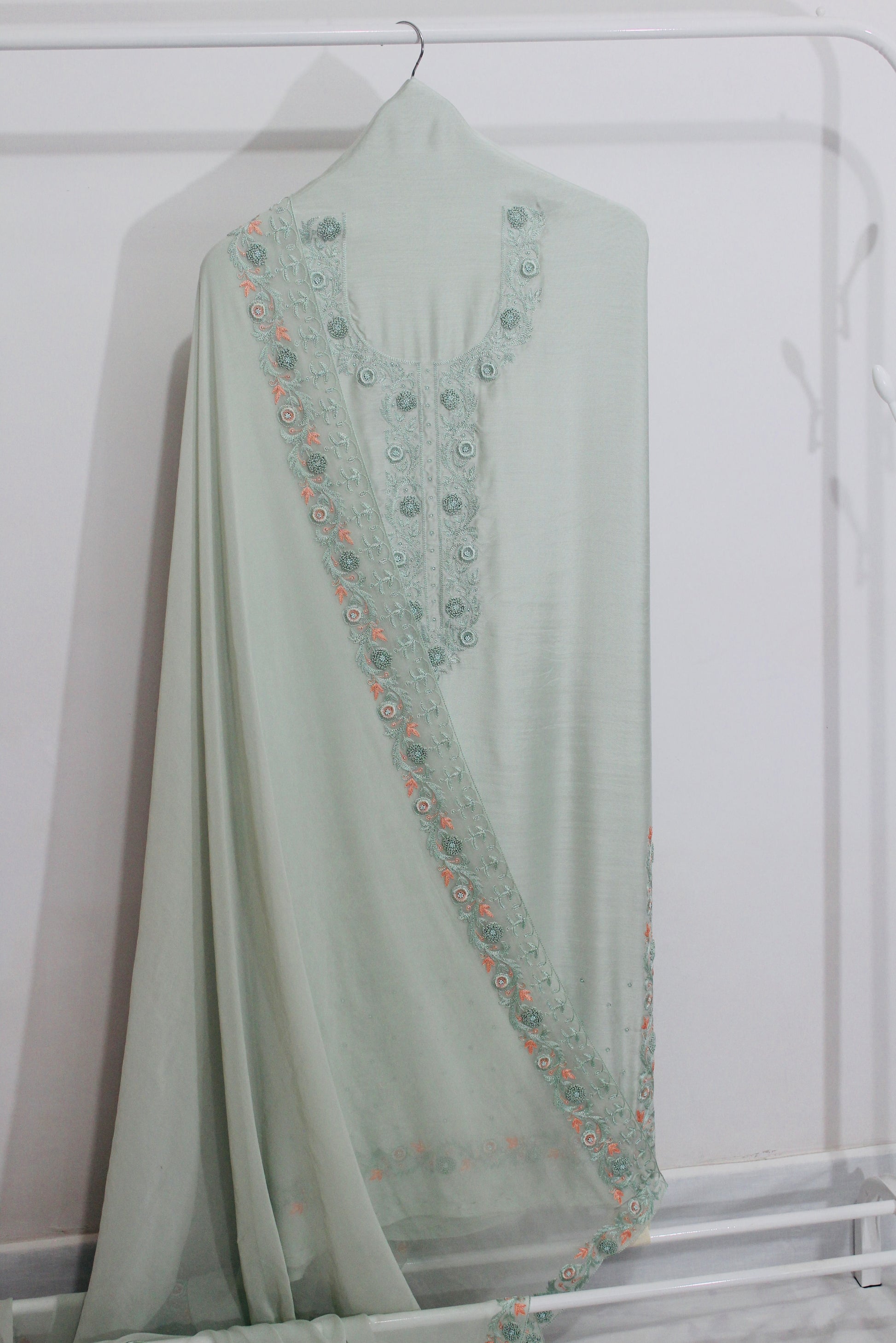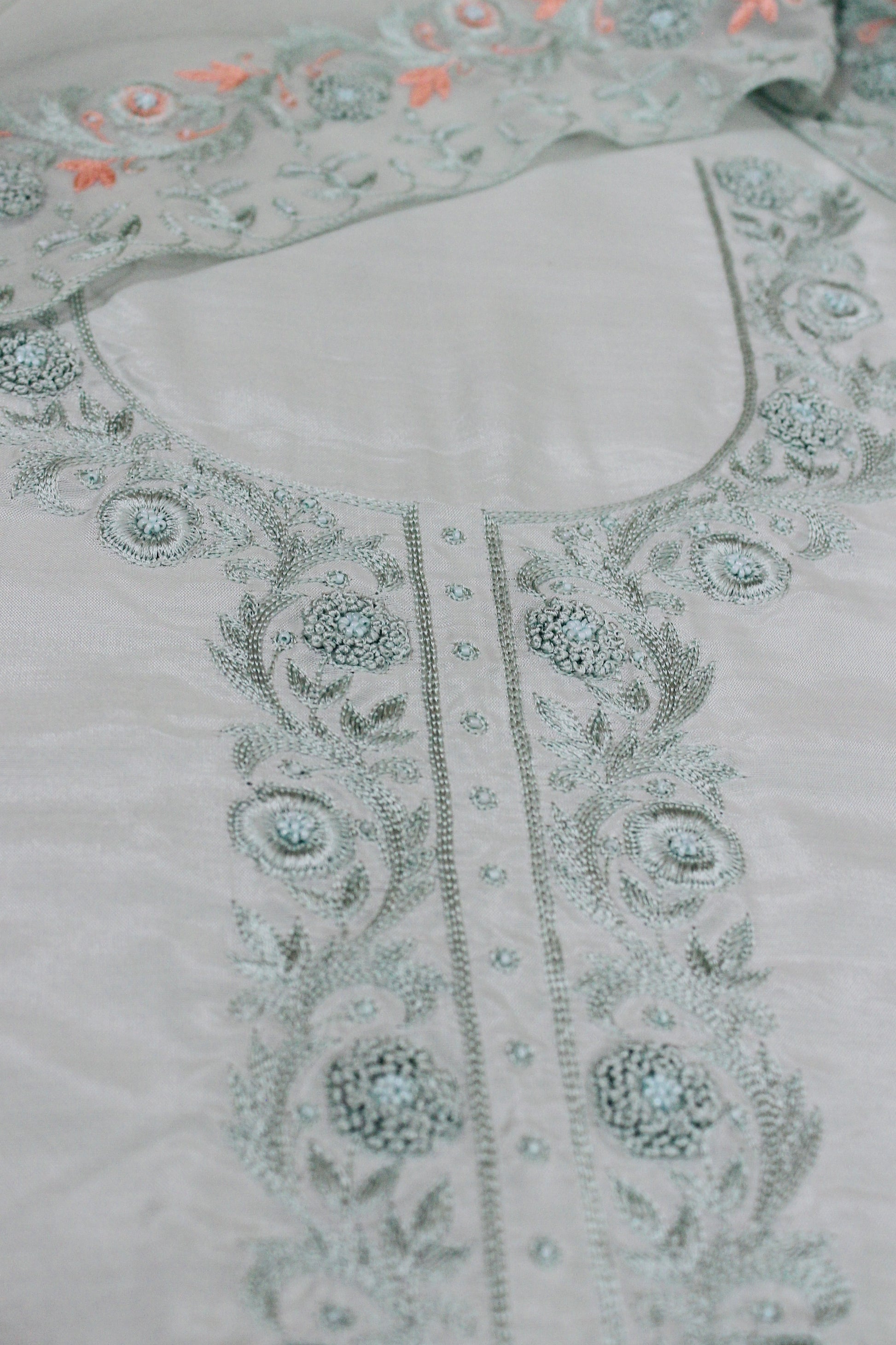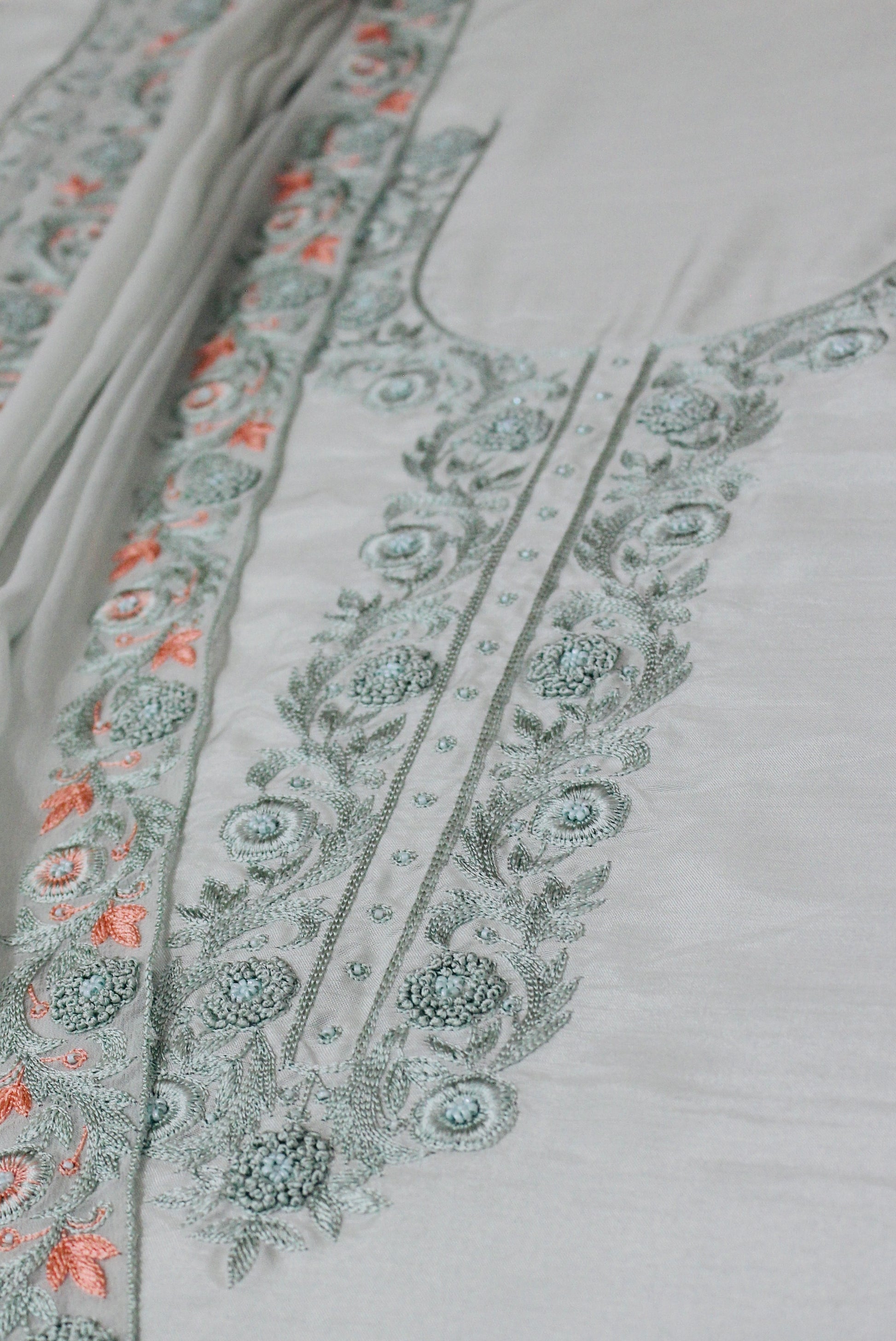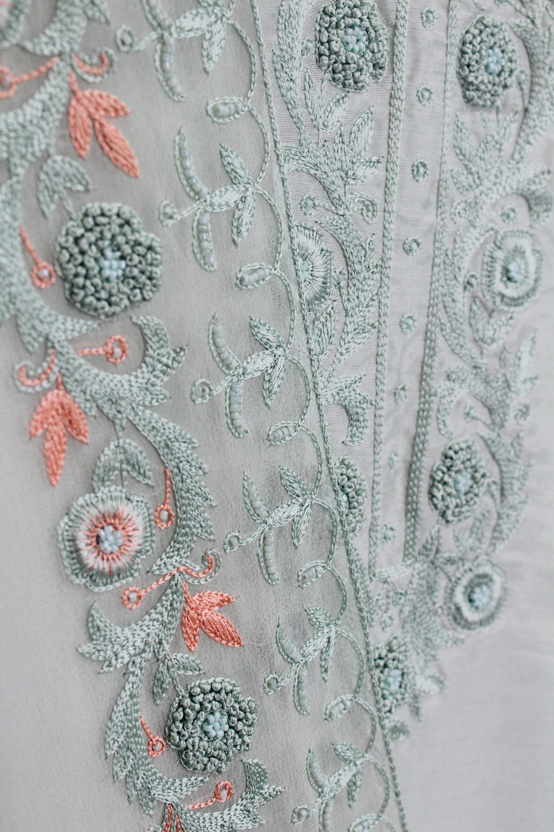 Discover the perfect blend of tradition and contemporary style with this intricately designed fabric with resham and poth work. This piece offers a unique and sophisticated look, ideal for special occasions or everyday wear.