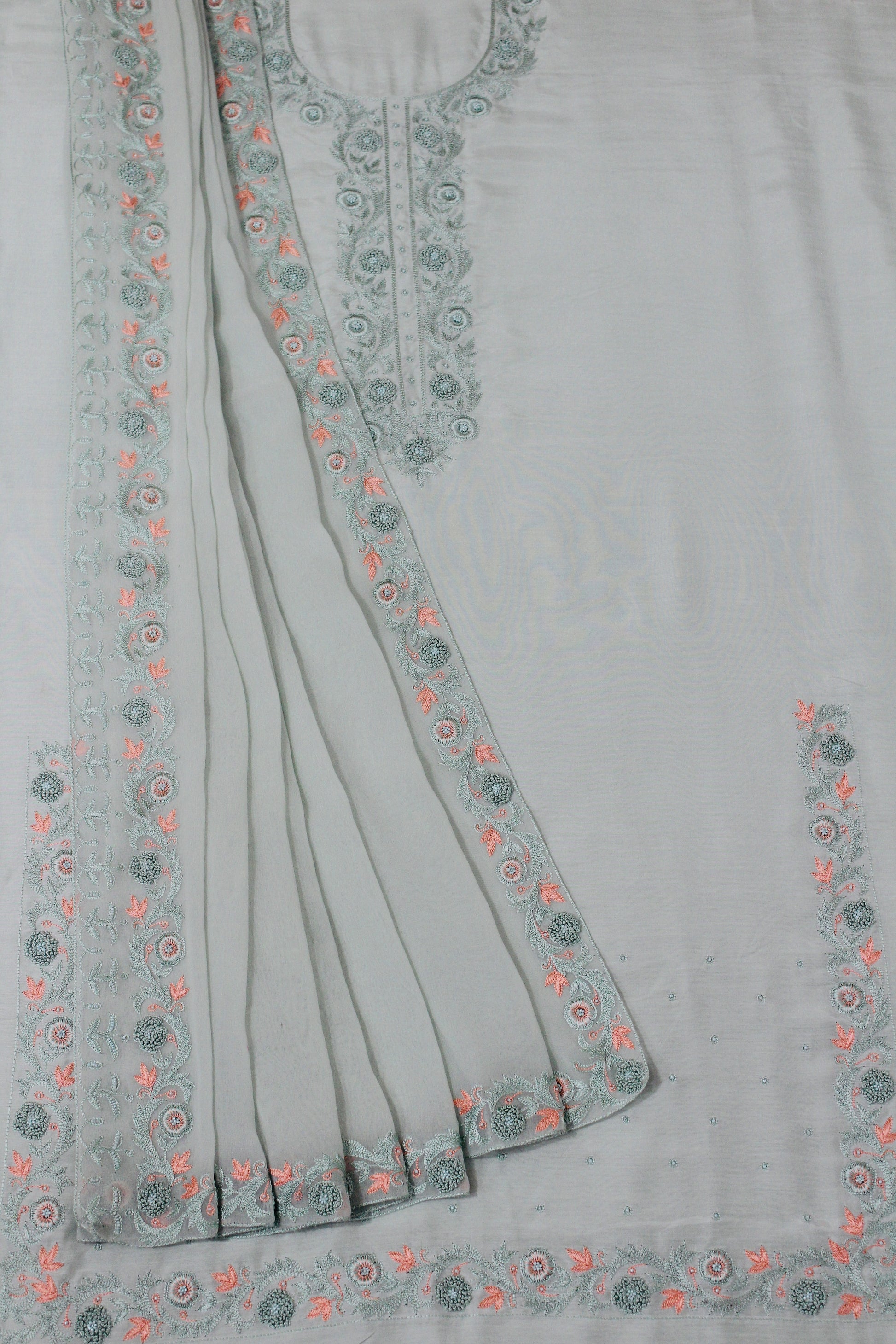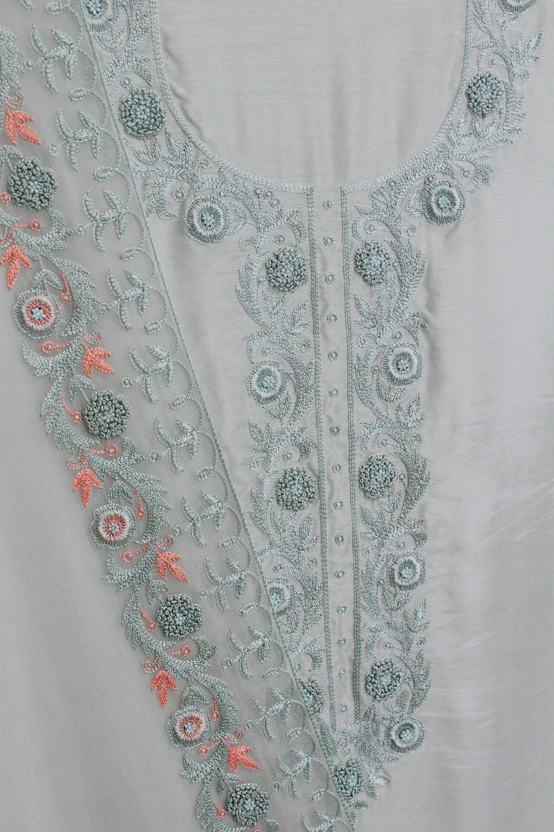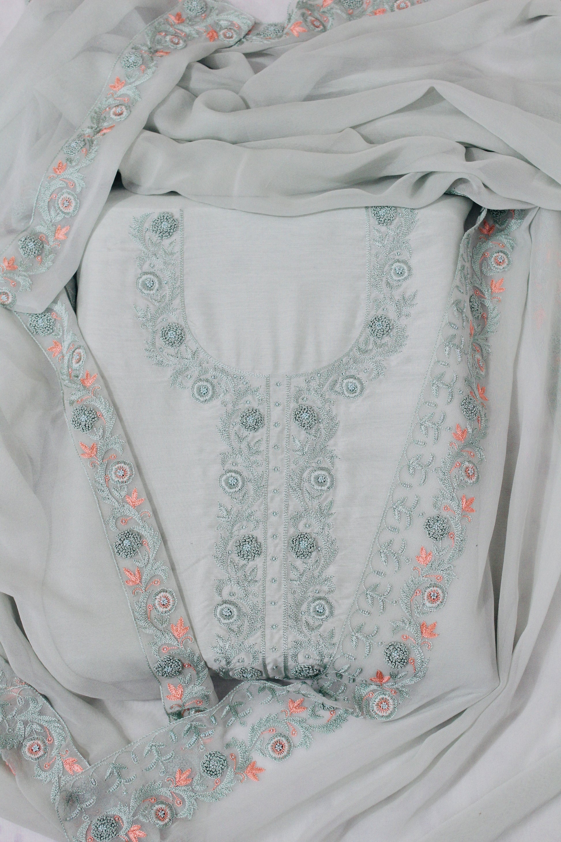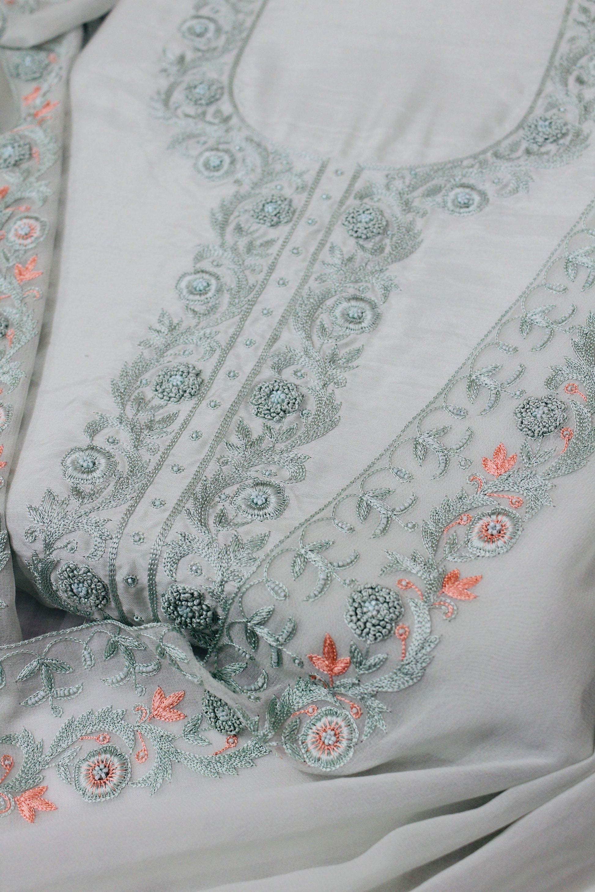 Discover the perfect blend of tradition and contemporary style with this intricately designed fabric with resham and poth work. This piece offers a unique and sophisticated look, ideal for special occasions or everyday wear.