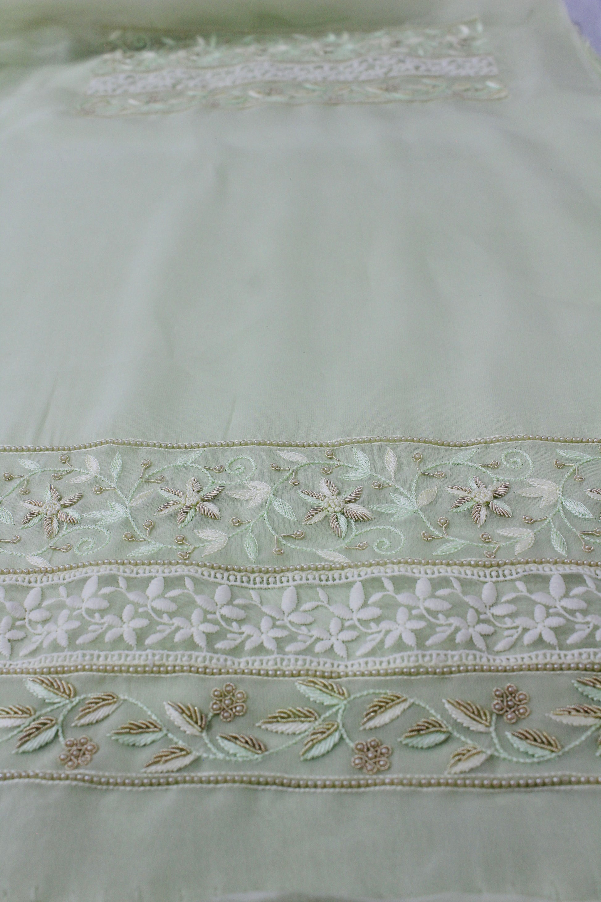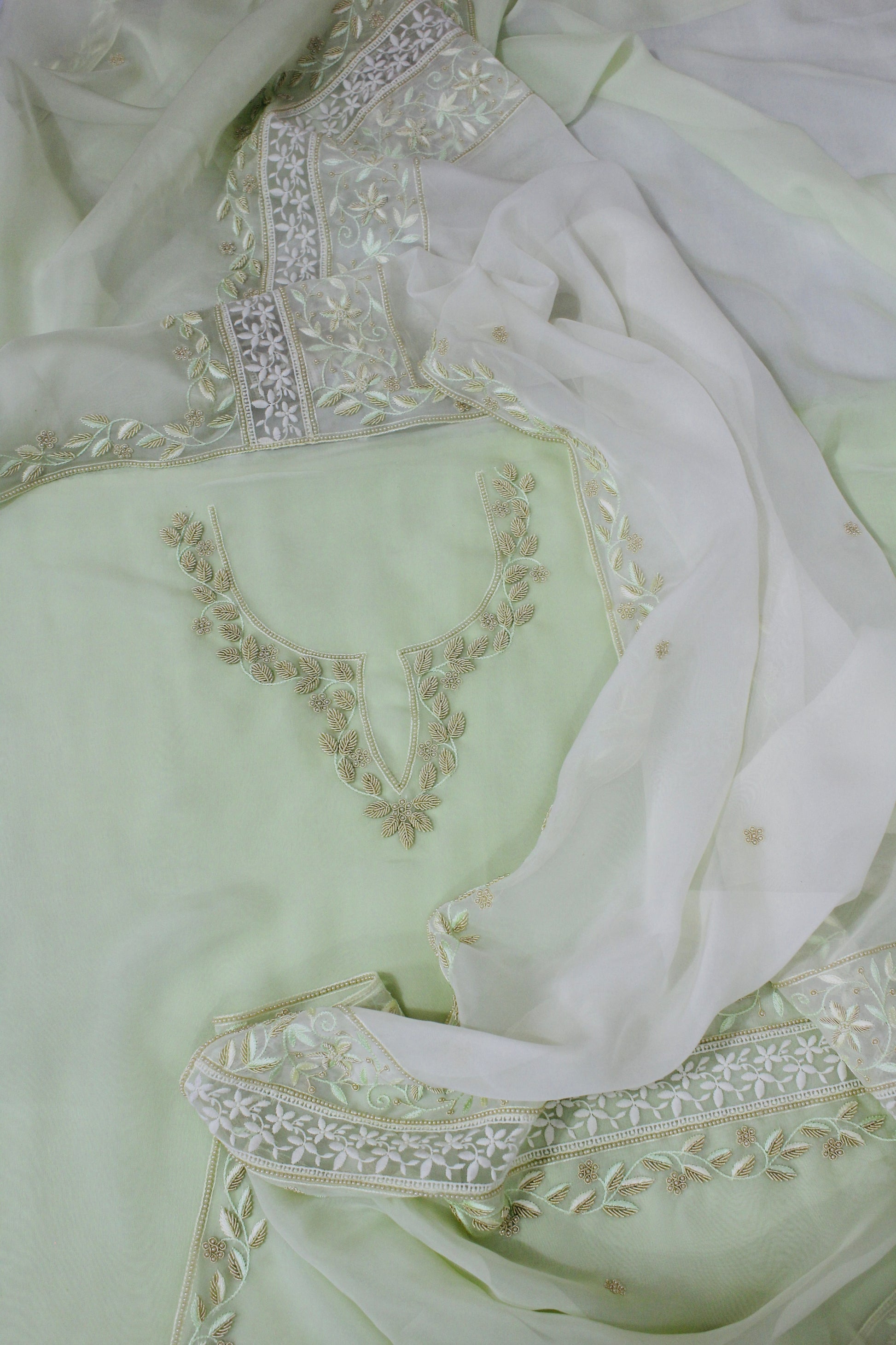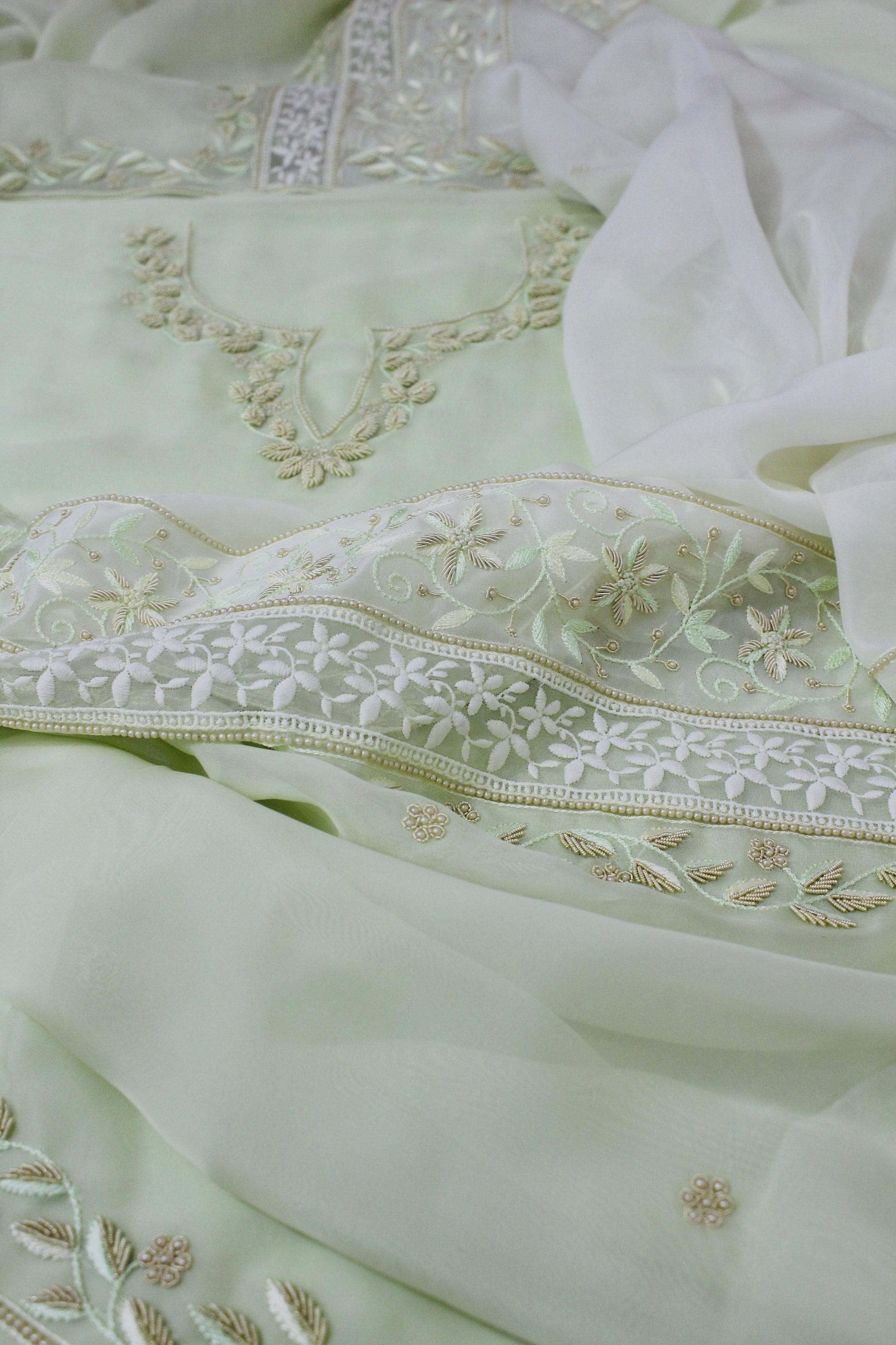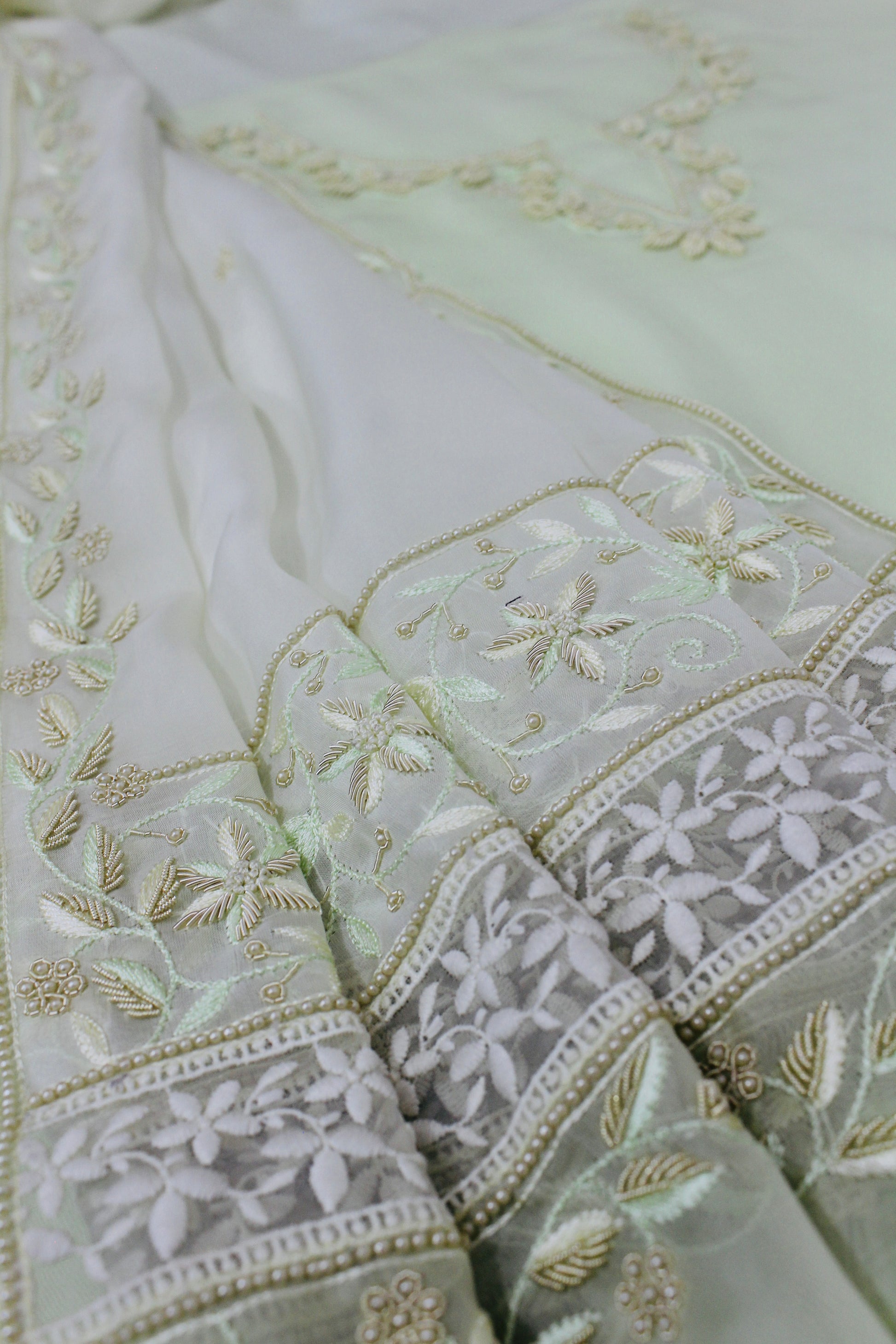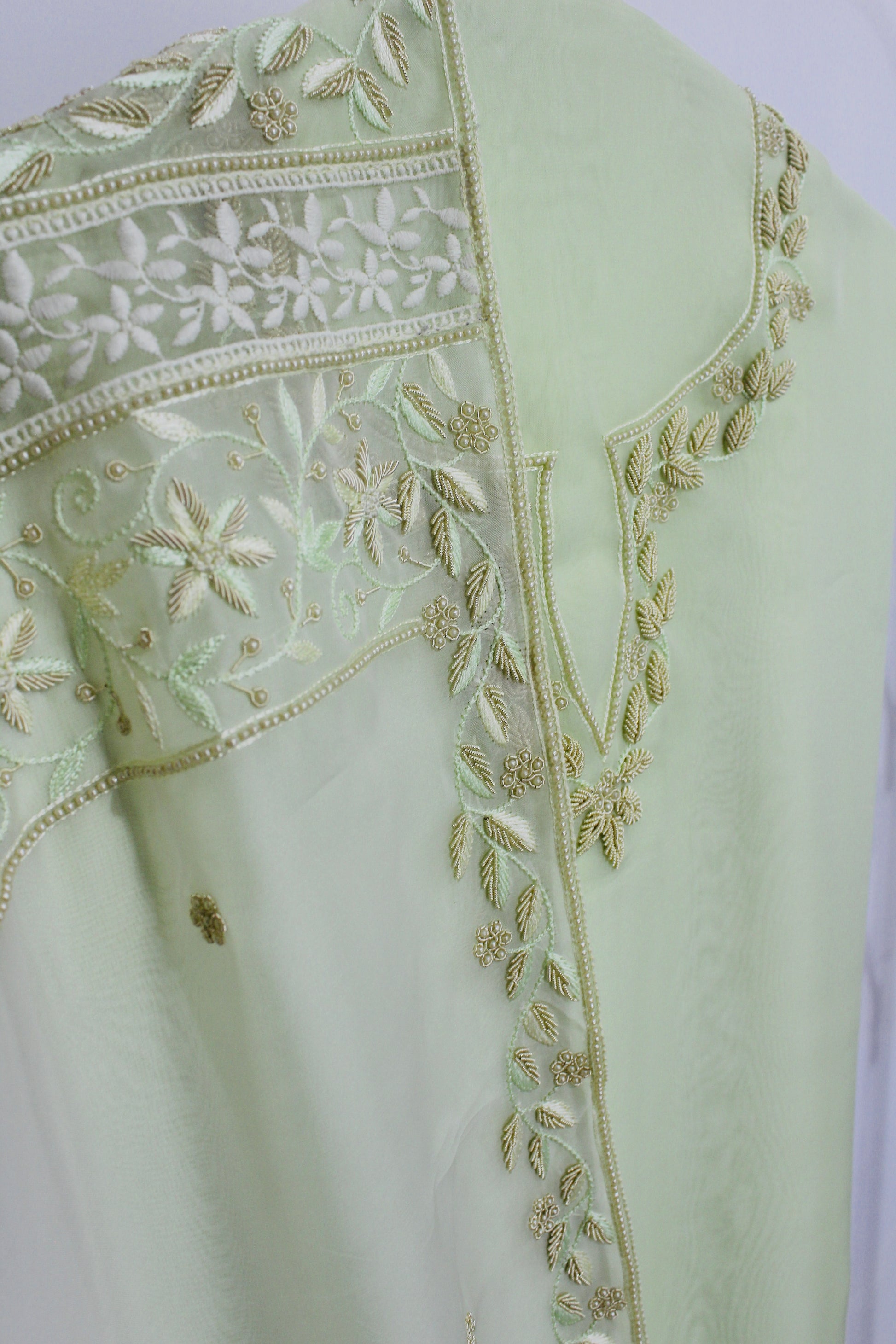 Crafted with exquisite craftsmanship and attention to detail, this ethnic wear features intricate aari zardosi work along with a delicate embroidery of resham and moti that adds a touch of opulence. The soft, muted tones of pista green evoke a sense of tranquility and serenity, making it perfect for any occasion.