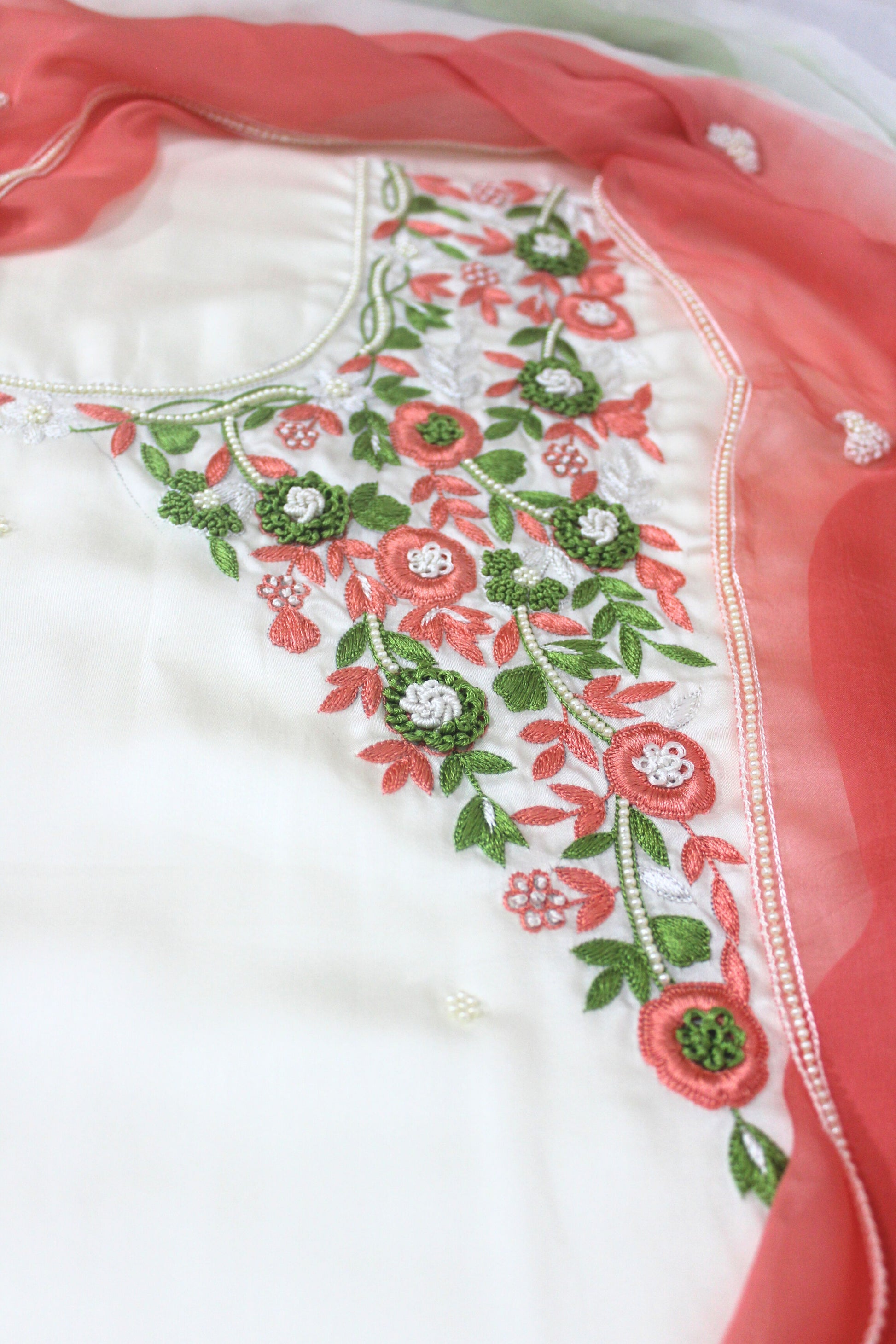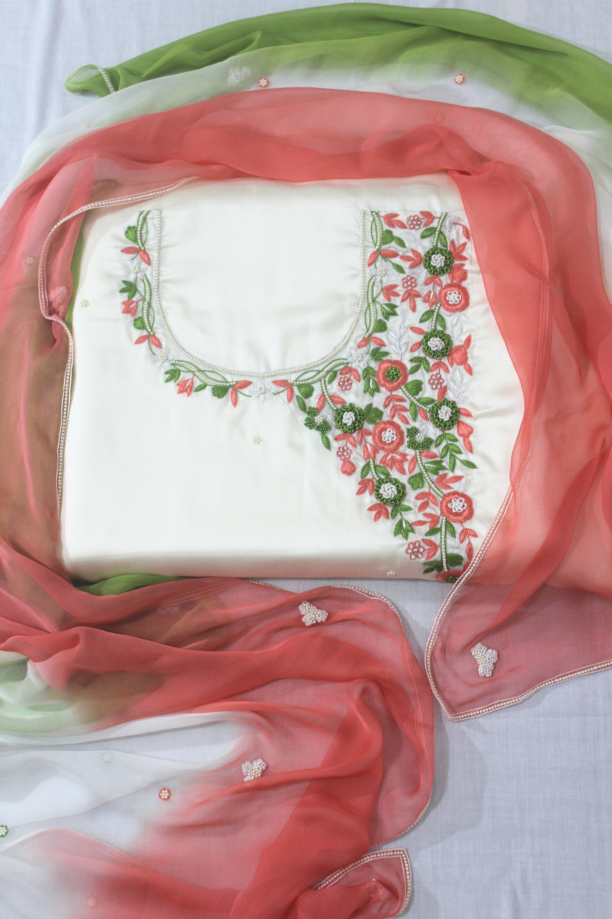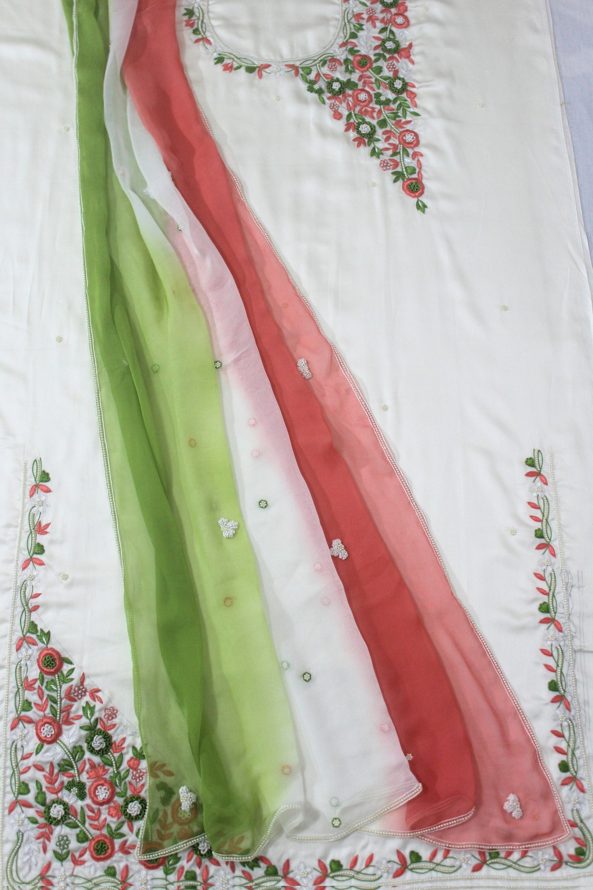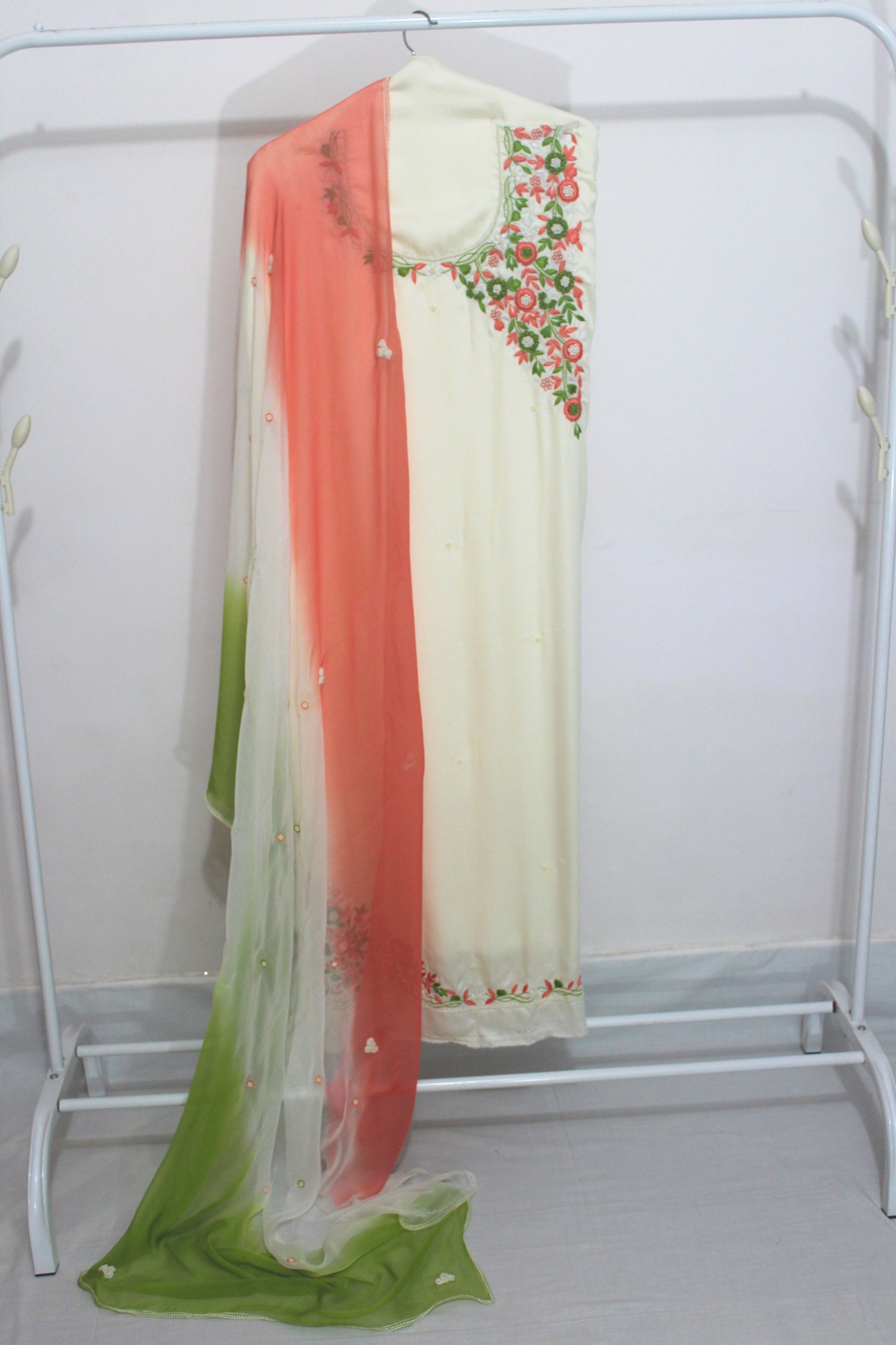 Indulge in the ethereal beauty of cream hues, with a multi-coloured dupatta that effortlessly complements every skin tone and occasion. Whether you're attending a traditional wedding ceremony, a festive celebration, or a formal event, this suit ensembles promise to make a lasting impression. Crafted from luxurious fabrics and adorned with exquisite detailing of resham and moti work, this cream-colored ethnic wear guarantees both comfort and sophistication.