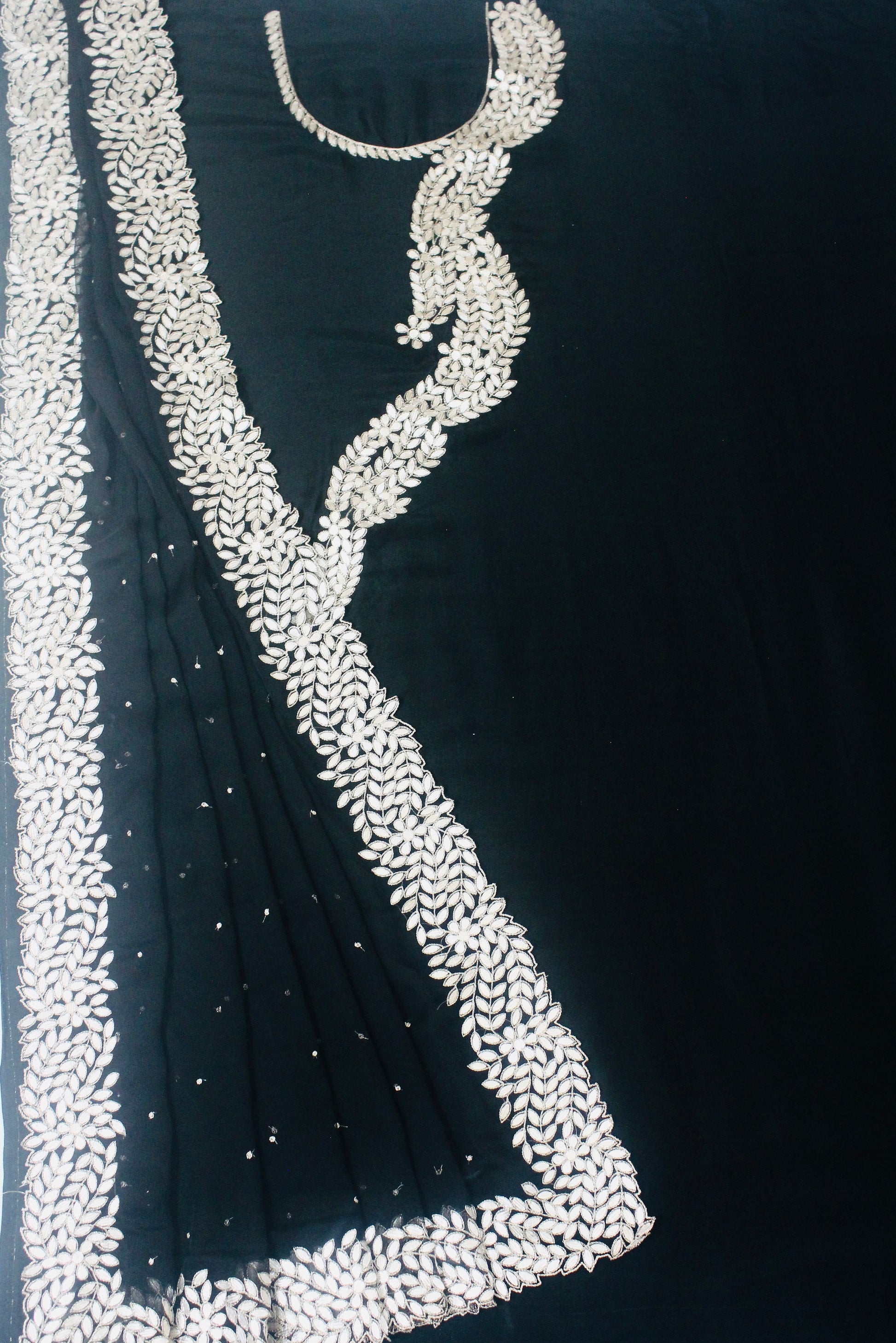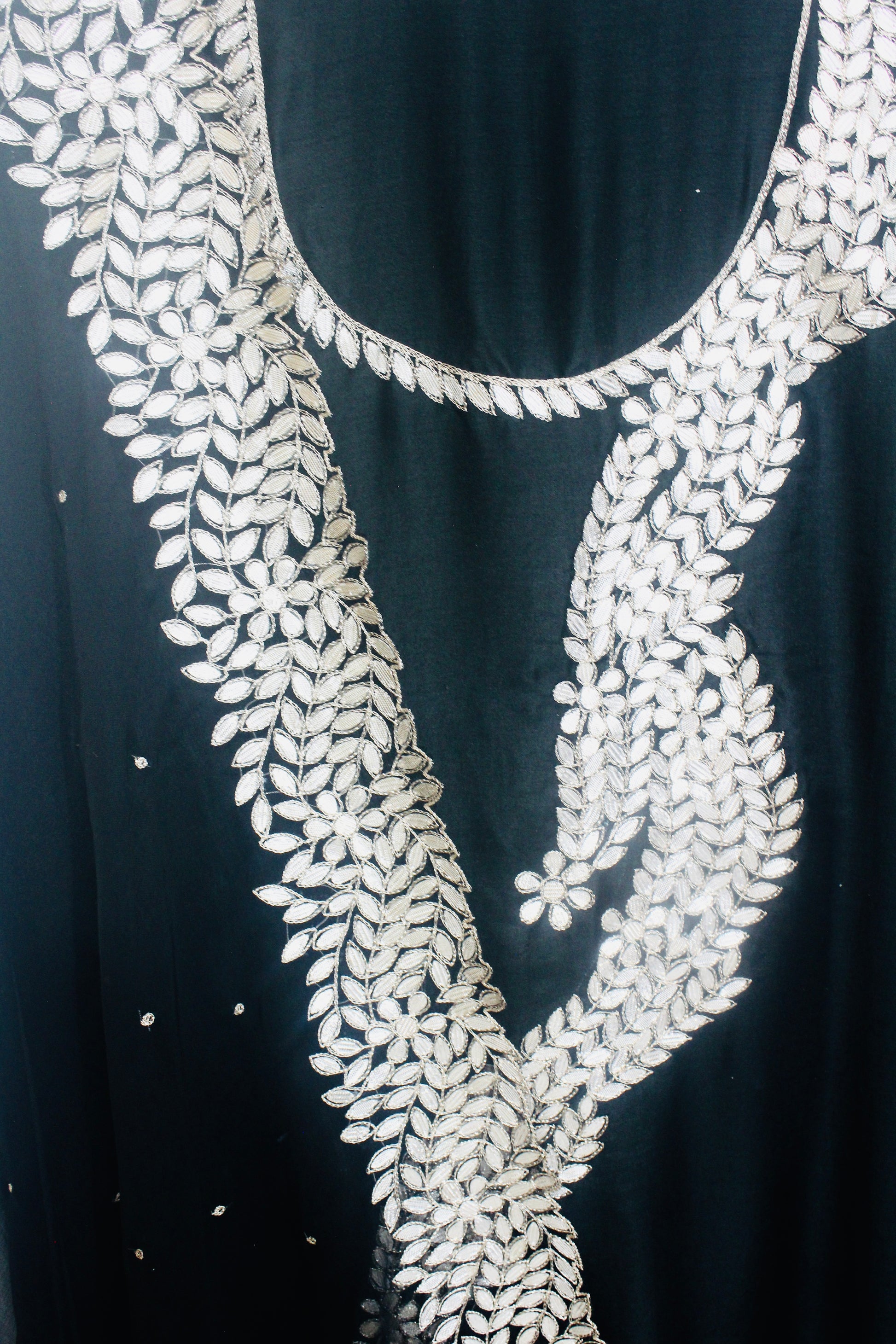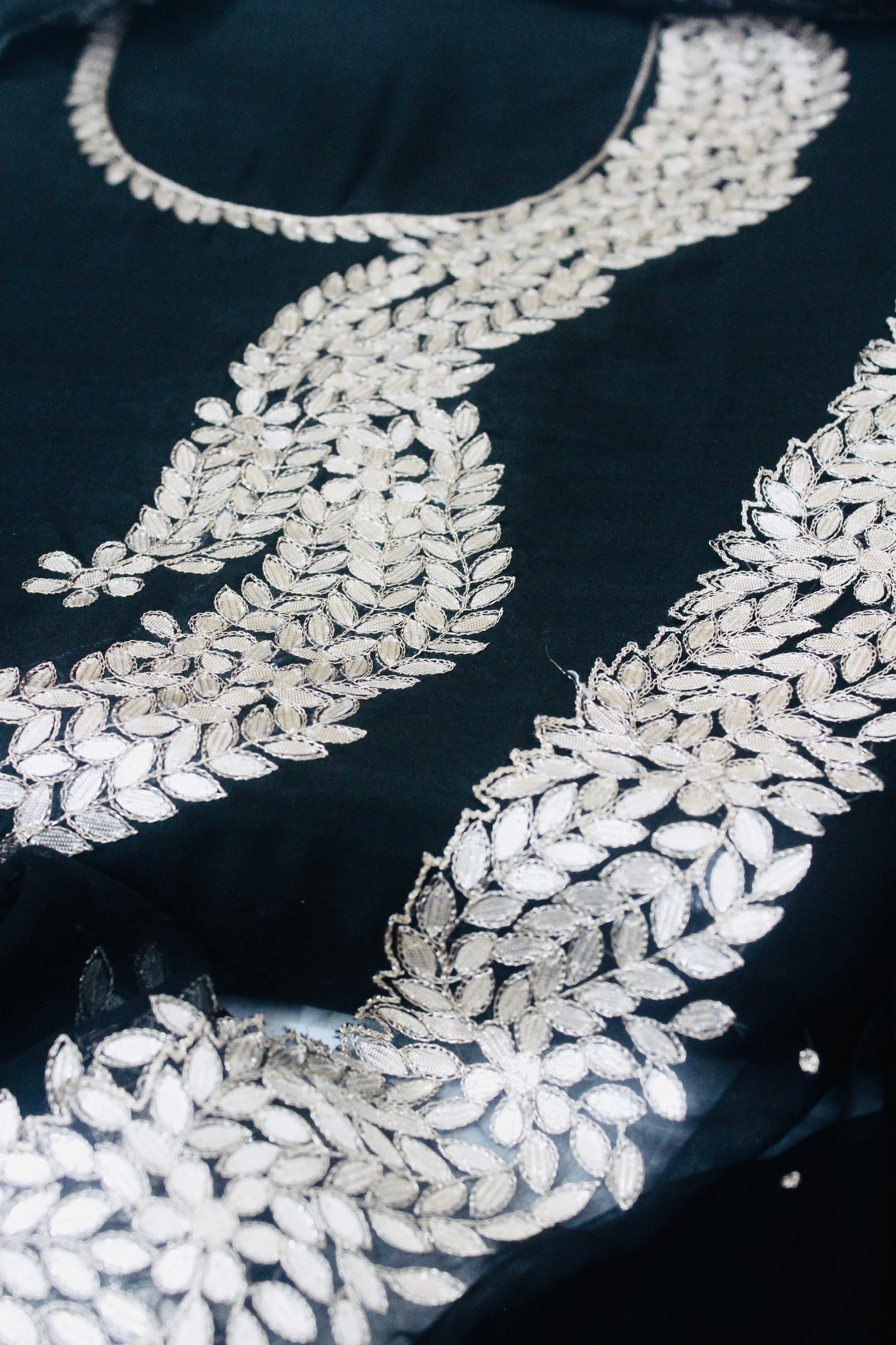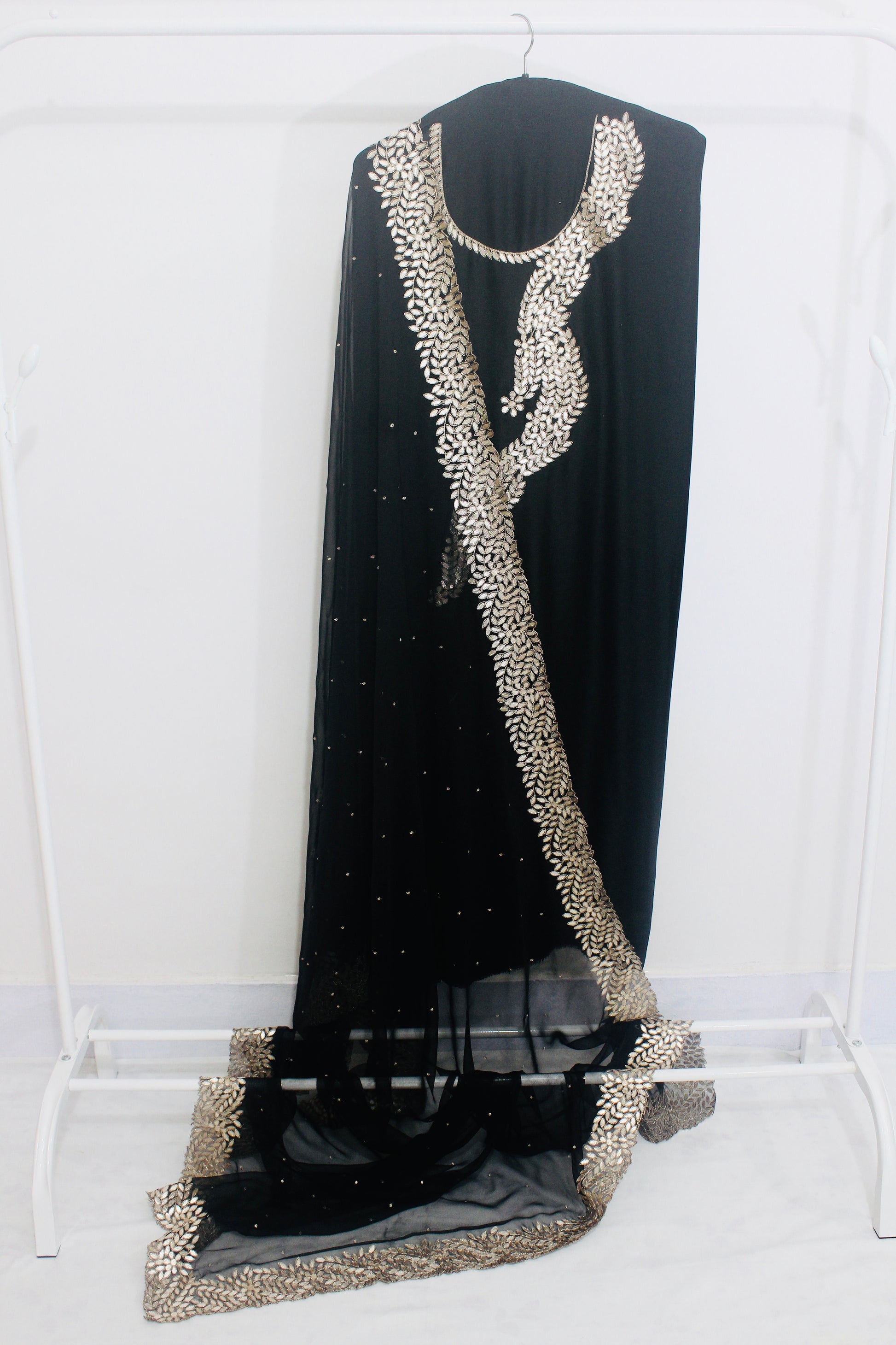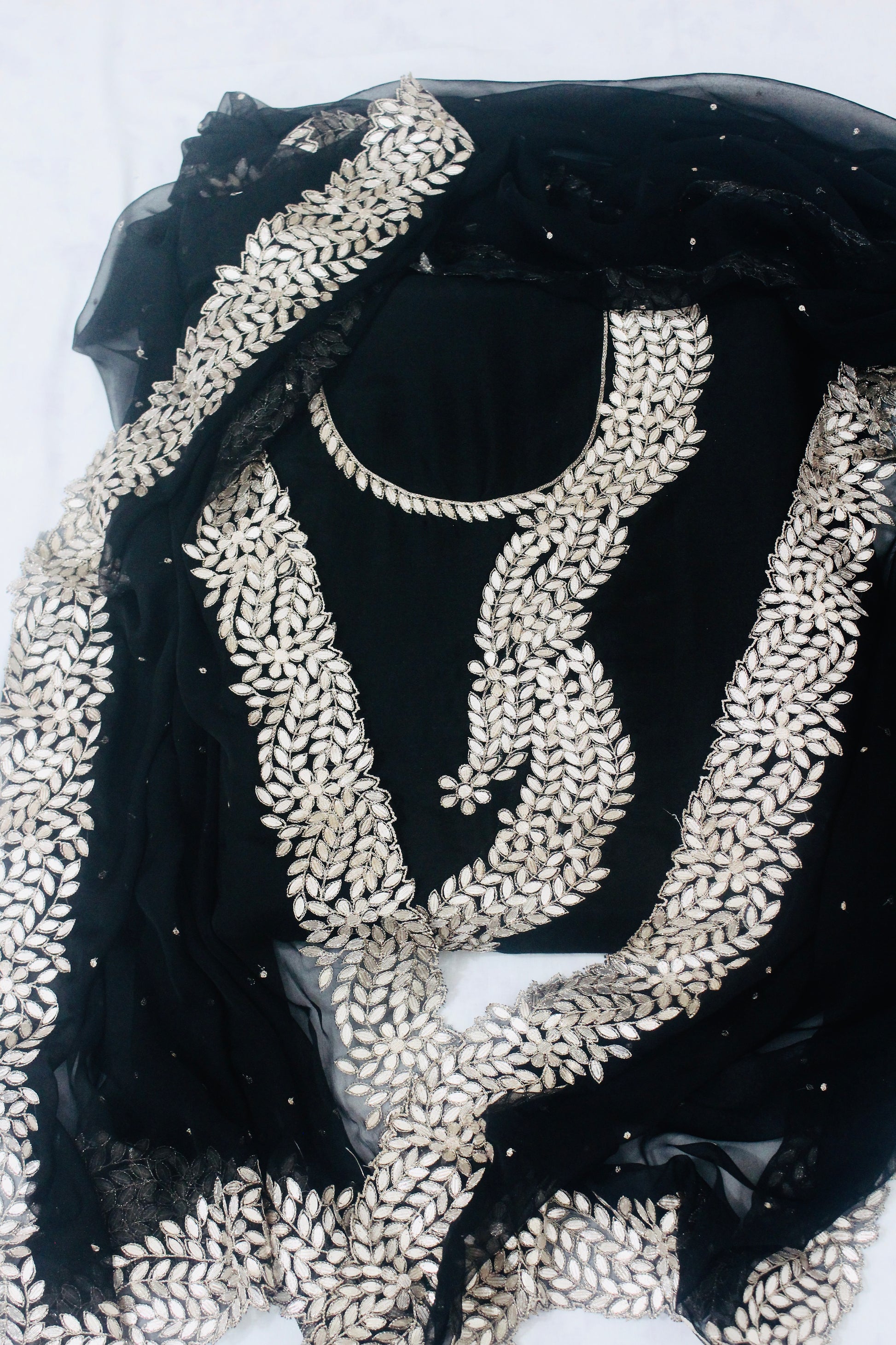 Indulge in luxury with this black coloured suit. The rich hue with gotapatti work on the neck and dupatta adds a touch of sophistication to any occasion. Elevate your style with this statement piece, crafted from premium materials for an exclusive look and feel. Perfect for the fashion-forward individual seeking elegance and refinement.